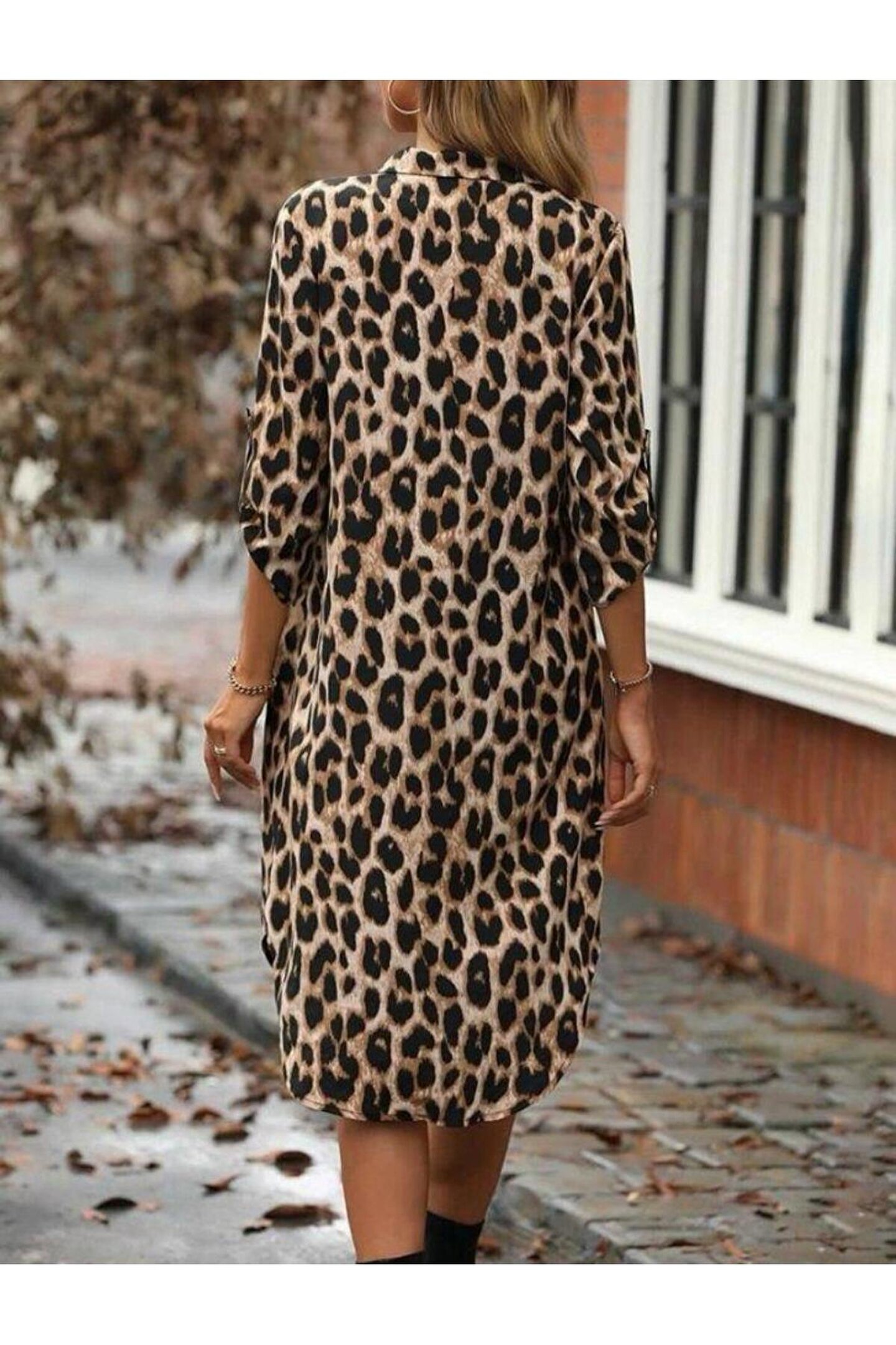 Queene Dreams Kadın Leopar Desenli Cep Detay Kolu Manşetli Moskrep Gömlek Elbise