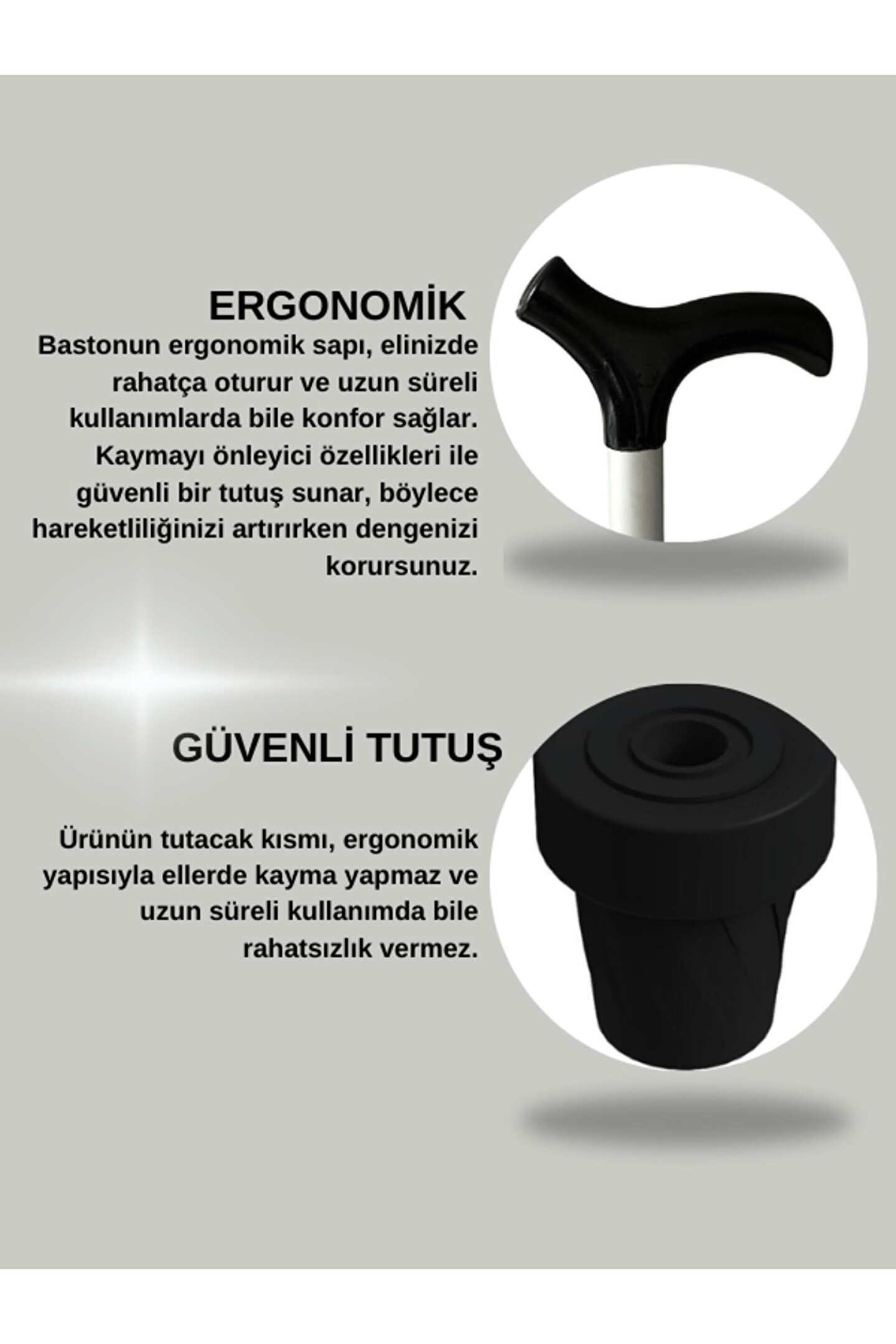 Rabır Asa Baston (80cm-100cm); ; Ergonomik Tutamaklı; Vakumlu Papuç; Hafif aliminyum malzeme; Yükseklik ayarlı; Renk: Siyah-Gri;