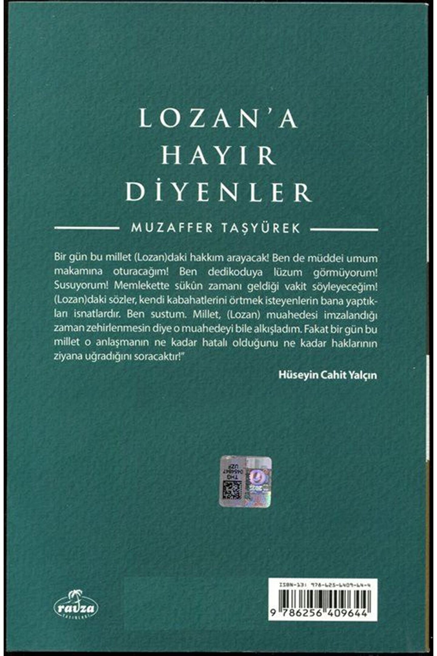 Lozan'a Hayır Diyenler Muzaffer Taşyürek / Ravza Yayınları Basım Yılı: 2023; Baskı: 1; Sayfa Sayısı: 496; Kağıt Türü: Kitap Kağıdı; Ebat: 13,5 x 21; Dil: Türkçe; Cilt Durumu: Karton Kapak; ISBN: 6256409644; ISBN: 9786256409644; Yazar: Muzaffer Taşyürek; Bir gün bu millet (Lozan)daki hakkım arayacak! Ben de muddei umum makamına oturacağım! Ben dedikoduya lüzum görmüyorum! Susuyorum! Memlekette sükûn zamanı geldiği vakit söyleyeceğim! (Lozan)daki sözler kendi kabahatlerini örtmek isteyenlerin bana yaptıkları isnatlardır.; Ben sustum Millet (Lozan) muahedesi imzalandığı zaman zehirlenmesin diye o muahedeyi bile alkışladım.; Fakat bir gün bu millet o anlaşmanın ne kadar hatalı olduğunu ne kadar haklarının ziyana uğradığını soracaktır!" Hüseyin Cahit Yalçın