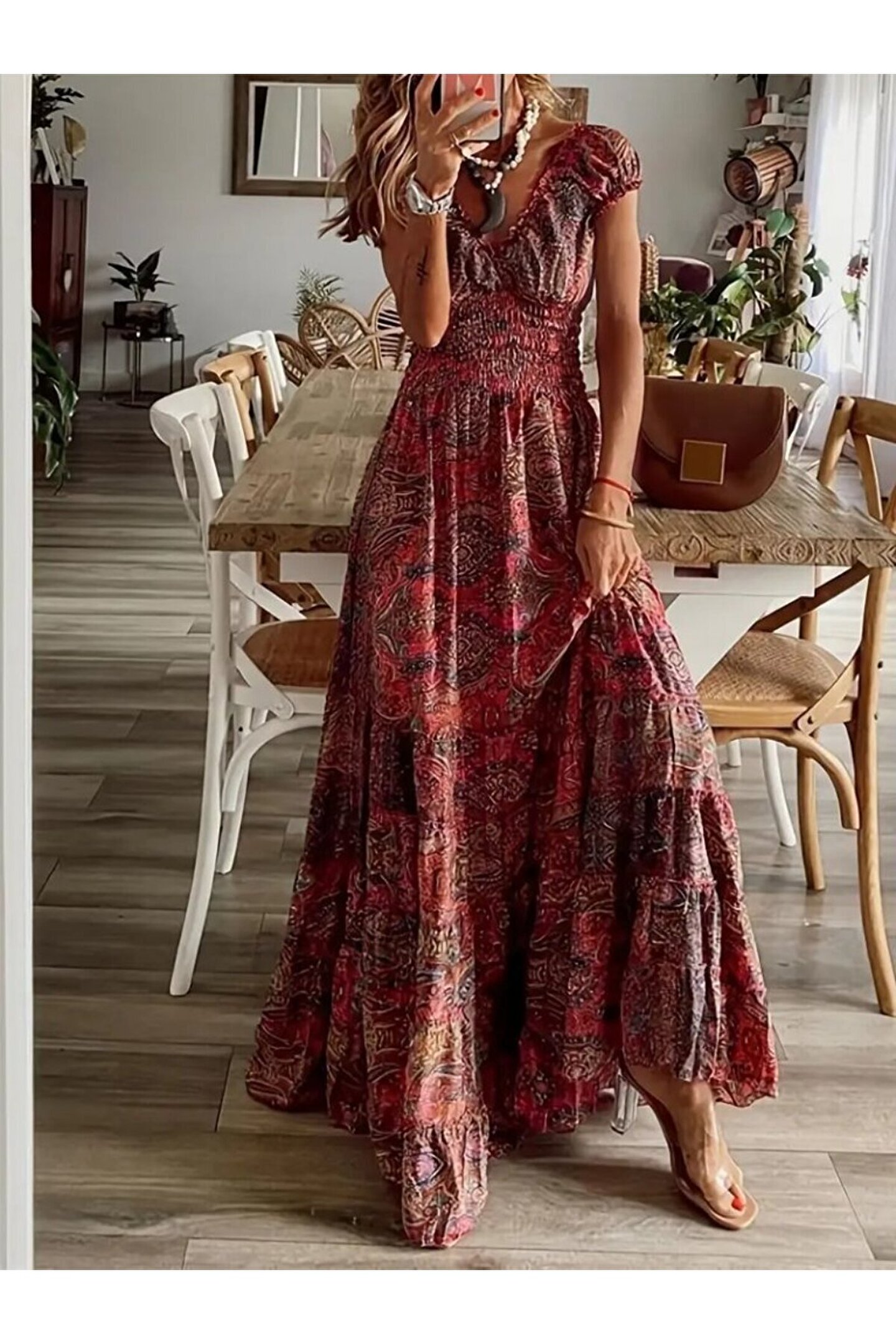 Kadın Kısa Kollu V Yakalı Beli Gipeli Desenli Süprem Maksi Elbise