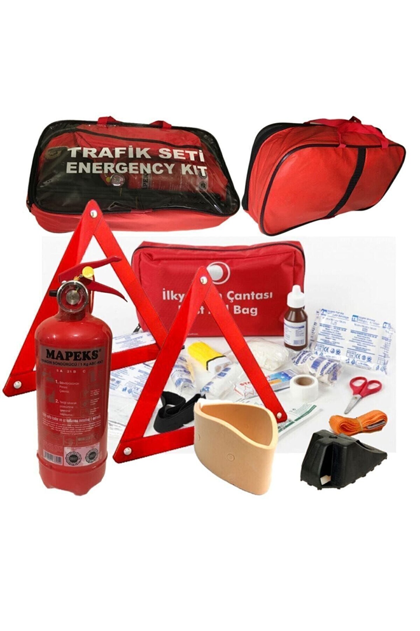 Trafik Seti muayene ve yönetmelik uyumlu olmasıyla sürücülerin trafikteki güvencesi haline geliyor.; ; Acil durumlarda yaralılara etkili bir tedavi uygulayarak hasarları en aza indirmeyi sağlayan set, akıllı yerleşime sahip olması sayesinde paniklemeyi önlemeye yardımcı oluyor.; ; Kullanışlı çantası arabanın birçok noktasına yerleştirilebilen trafik seti dayanıklı dış kaplamasıyla sarsıntılara karşı korunaklı bir yapı içeriyor.; ; İçeriğinde yer alan birçok hayati malzeme sayesinde ilkyardım ekipleri kaza yerine ulaşana kadar hayat kurtarıcı tedaviler uygulanabiliyor.; ; Sağlıklı İlkyardım Sağlayan Set Plastik Takoz: 1 Adet Yangın Söndürücü: 1 Kg Sargı Bezi: 2 Adet Hidrofil Gaz: 1 Adet Flaster: 1 Adet Boyunluk: 1 Adet rafik Seti Muayene ve Yönetmelik