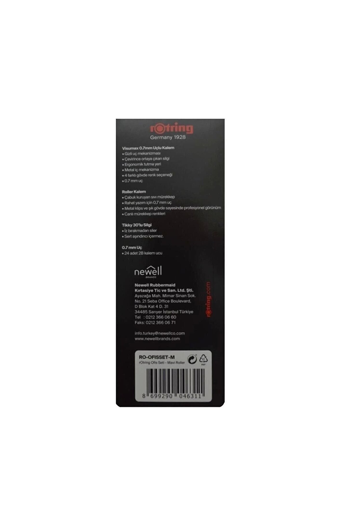 Rotring Visumax 0.7+ Roller 4 lü Set Mavi - Visumax 0.7 Versatil Kalem Siyah * Gizli uç mekanizması * Çeivirince ortaya çıkan silgi * Ergonomik tutma yeri * Metal iç mekanizma * 0.7 mm uç - Rotring Roller Kalem 0.7 Mavi * Çabuk kuruyan sıvı mürekkep * Rahat yazım için 0.7 mm uç * Metal klips ve şık gövde sayesinde profesyonel görünüm * Canlı mürekkep renkleri - Tikky Beyaz Silgi No: 30 * İz bırakmadan siler * Sert aşındırıcı içermez - 0.7 mm Kalem Ucu * 24 adet 2B kalem ucu içerir