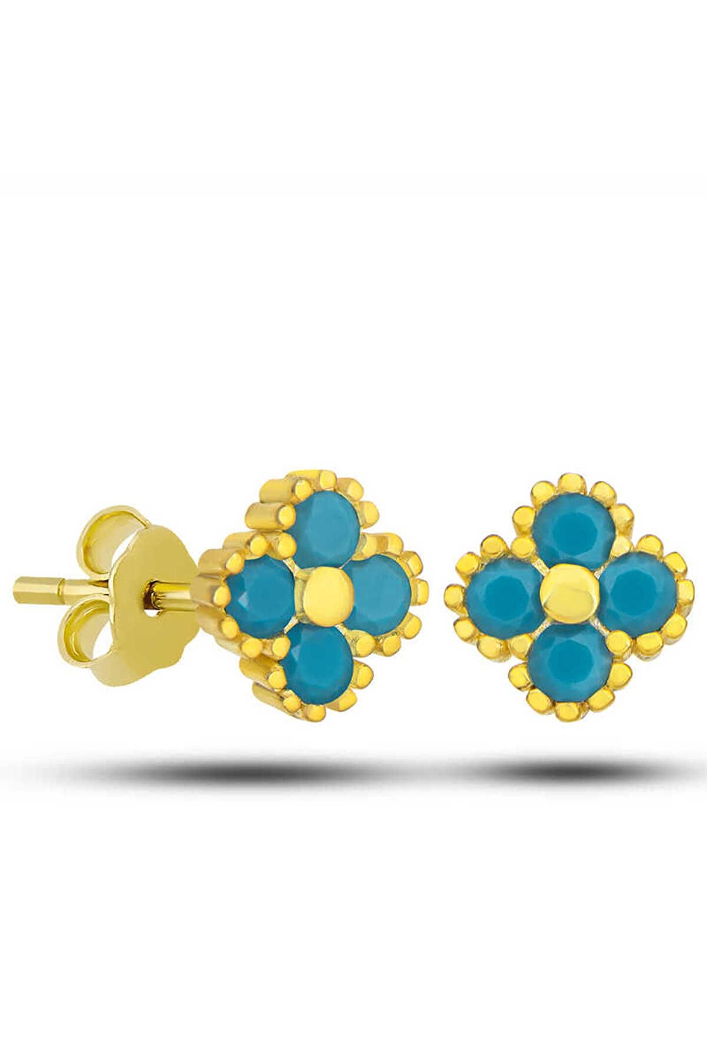 Gümüş Gold Yonca Çivili Turkuaz Taşlı Çocuk Küpe