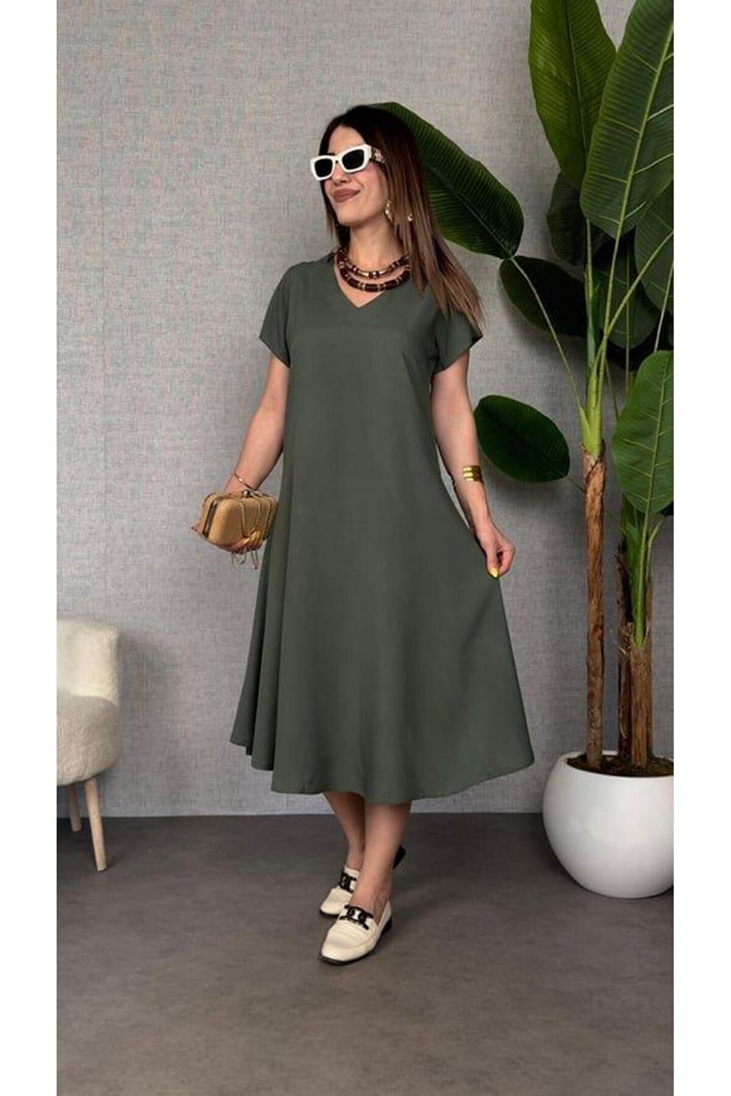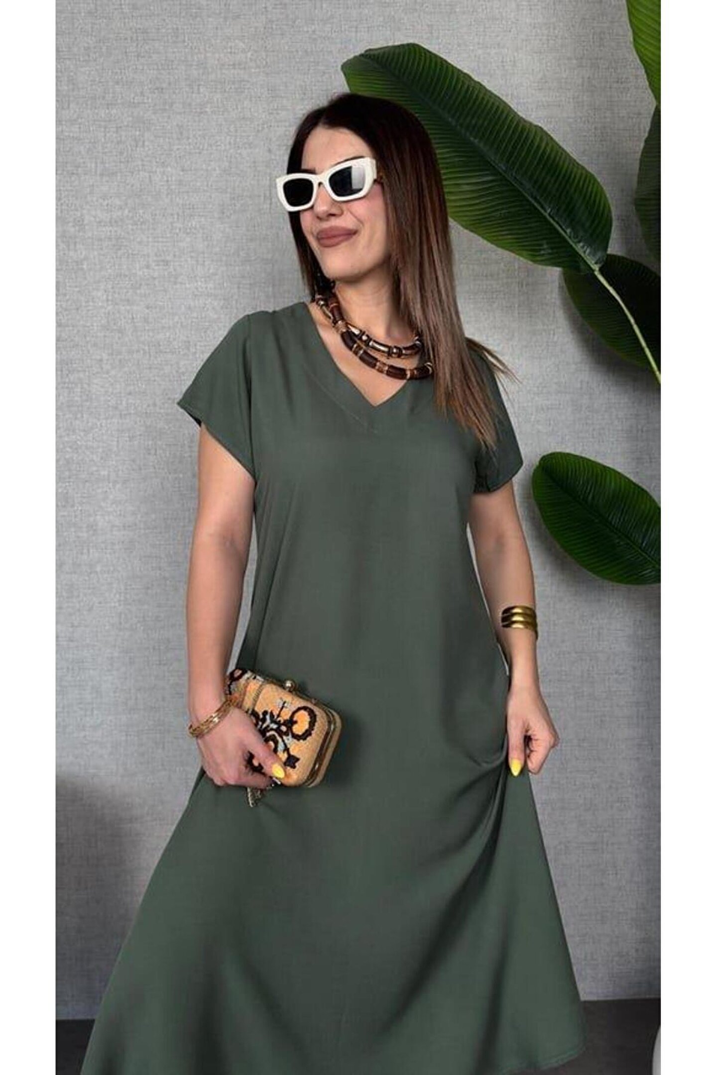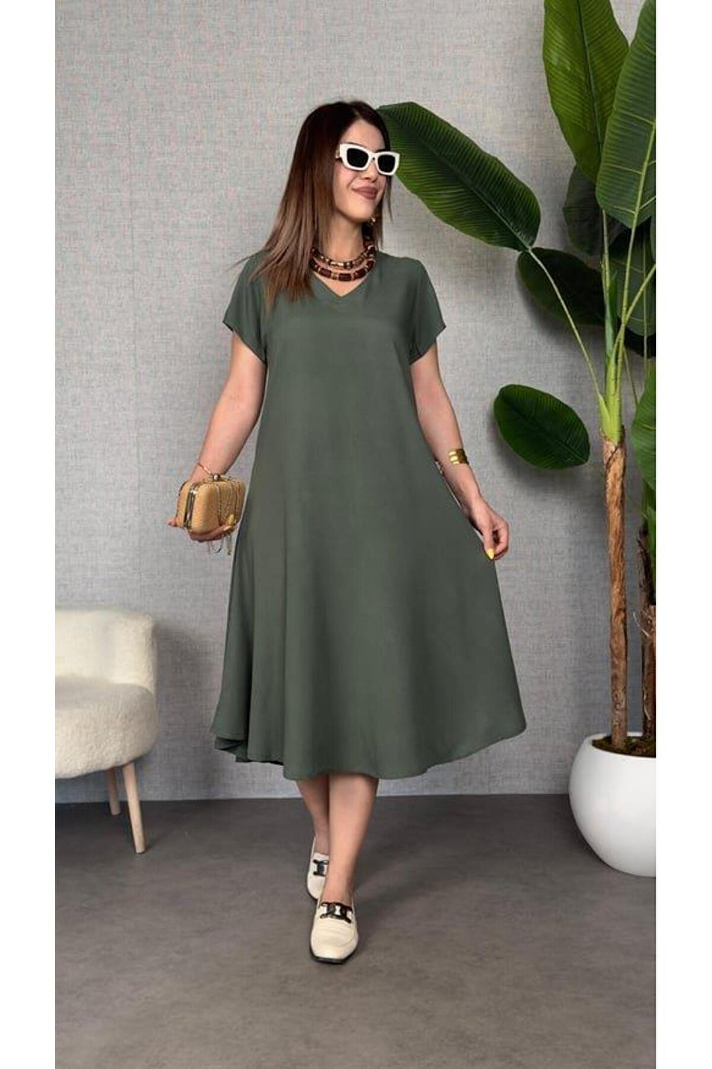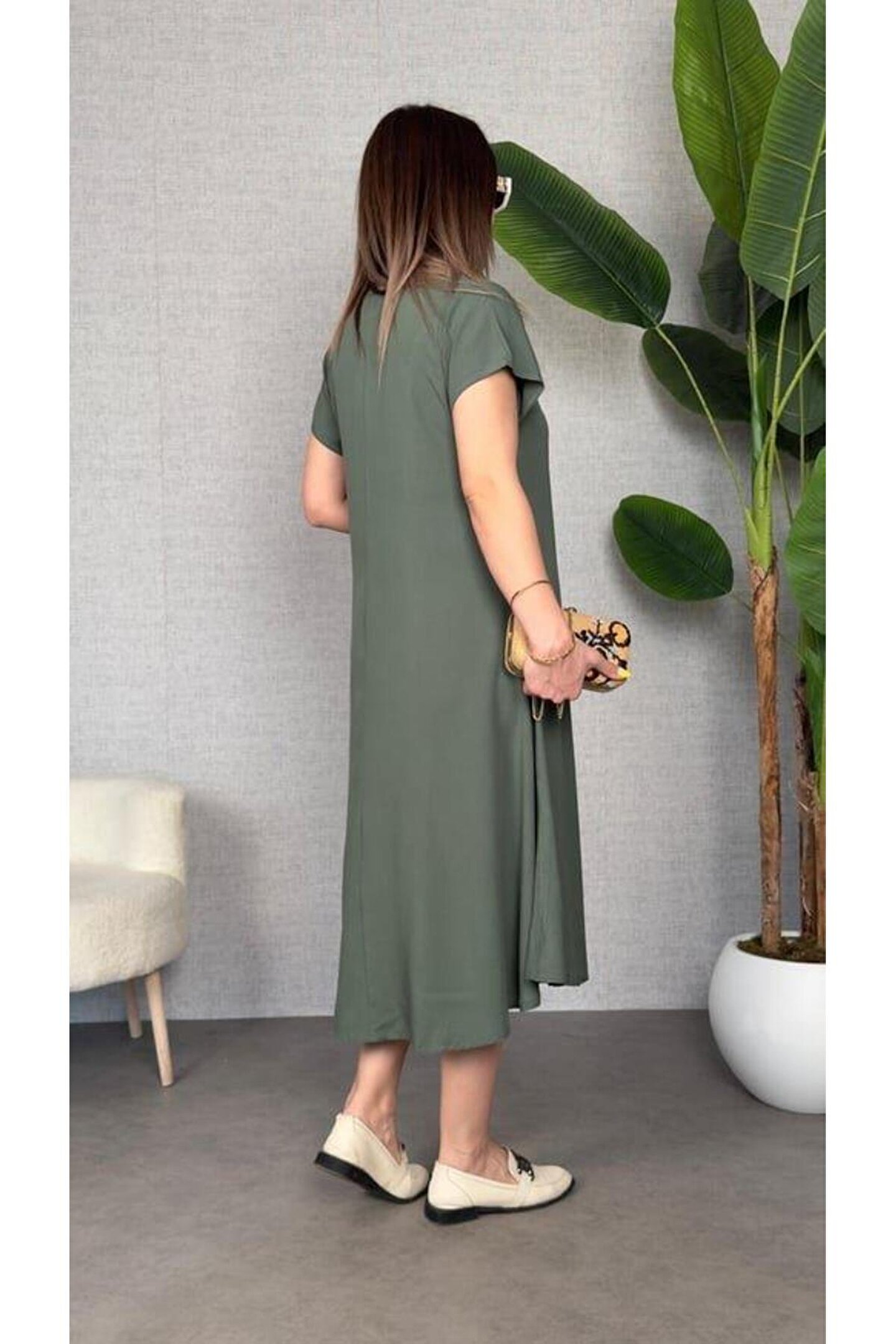 Kadın Kısa Kollu V Yaka Salaş Maxi Boy Elbise