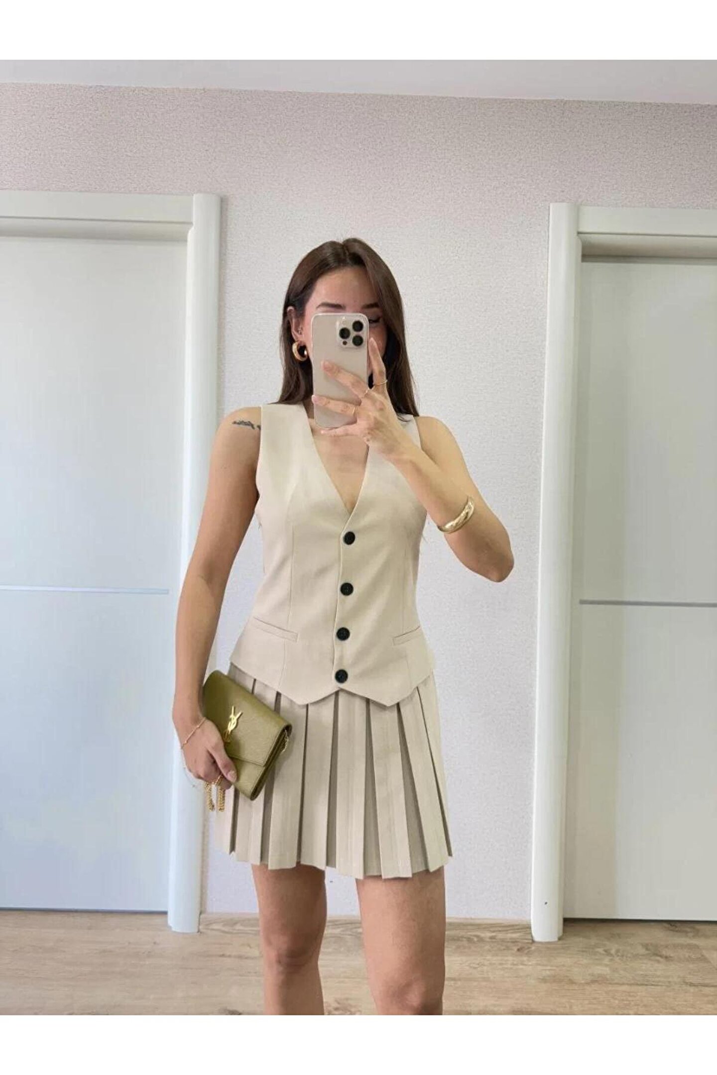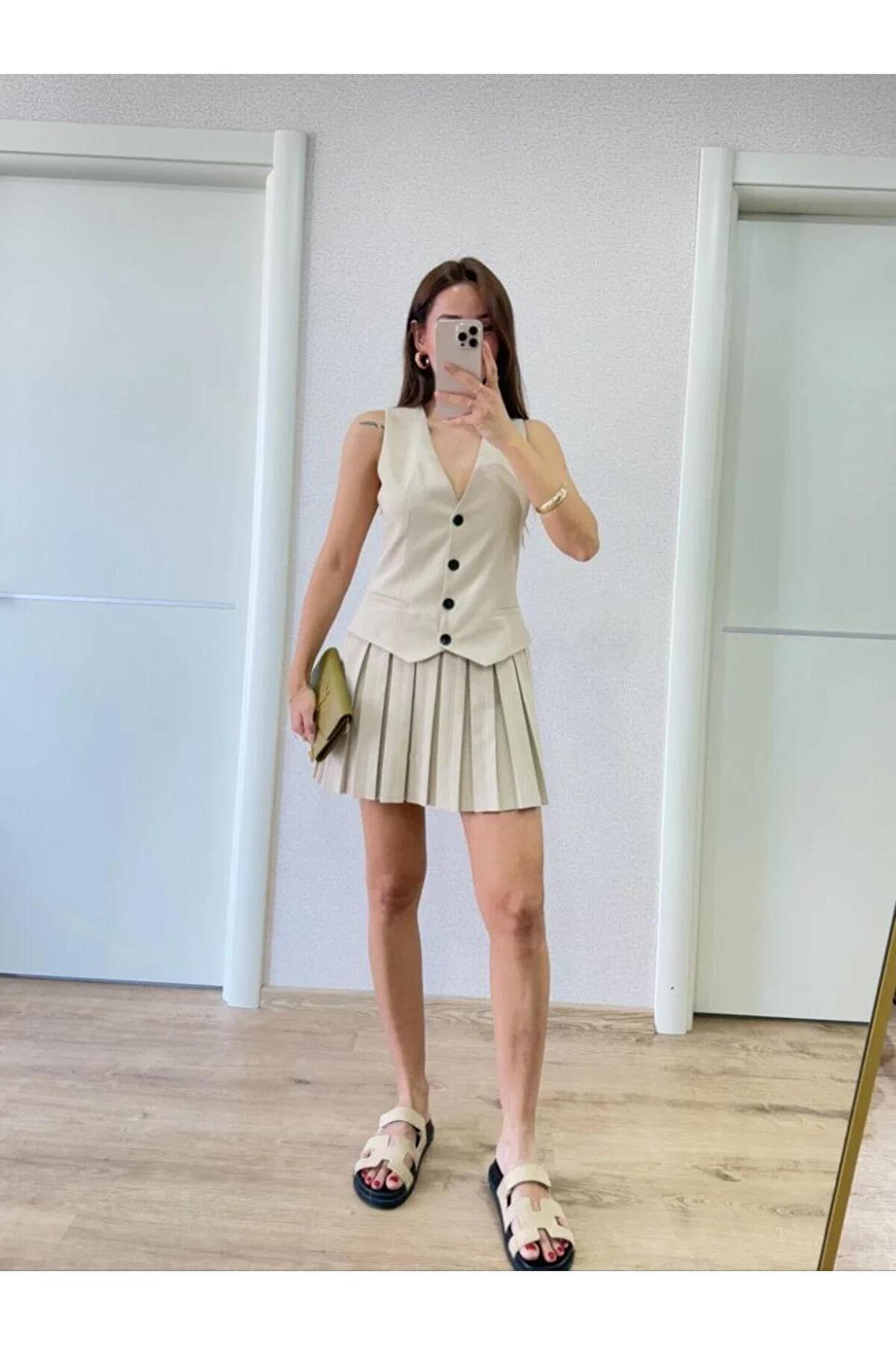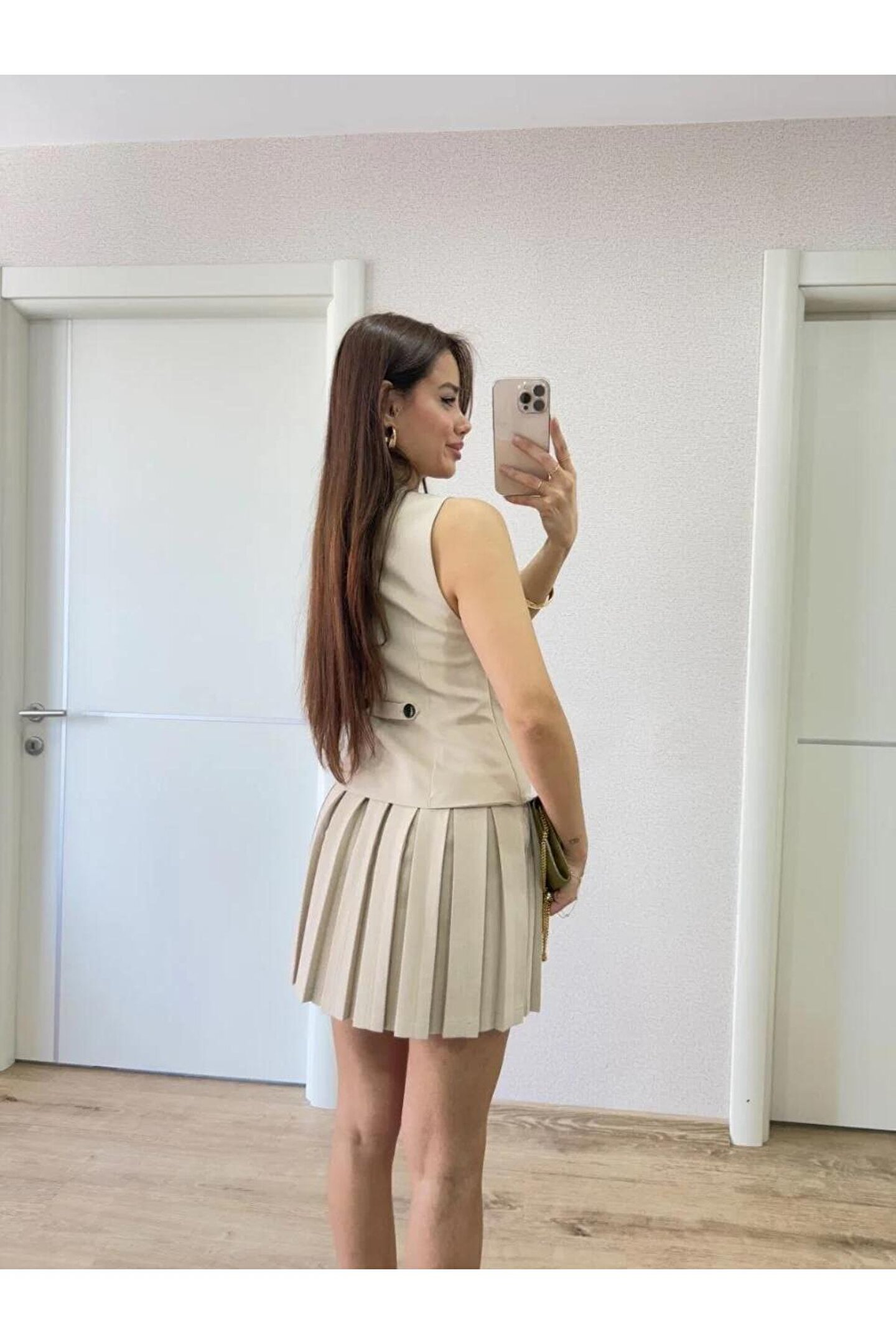 - İnce keten kumaştan üretilmiş, hafif ve rahat bir kullanım sunar.; - Düğmeli kapama detayına sahip olup, kolayca giyilip çıkarılabilir.; - Kemersiz tasarımı ile modern ve şık bir görünüm sağlar.; - Sadece tek parça olarak sunulur; ekstra aksesuar gerektirmez.; - İç göstermeyen yapısıyla gün boyu konforlu bir deneyim sunar.; - Baskısız deseniyle zamansız bir stil oluşturur.; - Her mevsime uygun, zarif ve şık bir tasarıma sahiptir.; - Ters çevrilerek 30°C'de yıkanması önerilir; düşük sıcaklıkta ütülenmelidir.; - Ürün rengine uygun deterjan kullanılması tavsiye edilir.; - Pileli silueti sayesinde feminen hatları ön plana çıkartır.; - Mini boyu ile hem gündüz hem de gece etkinliklerine uyum sağlar.; - Yetişkin yaş grubuna hitap eden geniş kullanıcı kitlesine sahiptir.; - Türkiye menşeli olmasıyla yerel üretim avantajını yansıtır.; - Kolsuz tasarımının yanında V yaka kesimiyle dekolte bölgesini zarifçe vurgular.