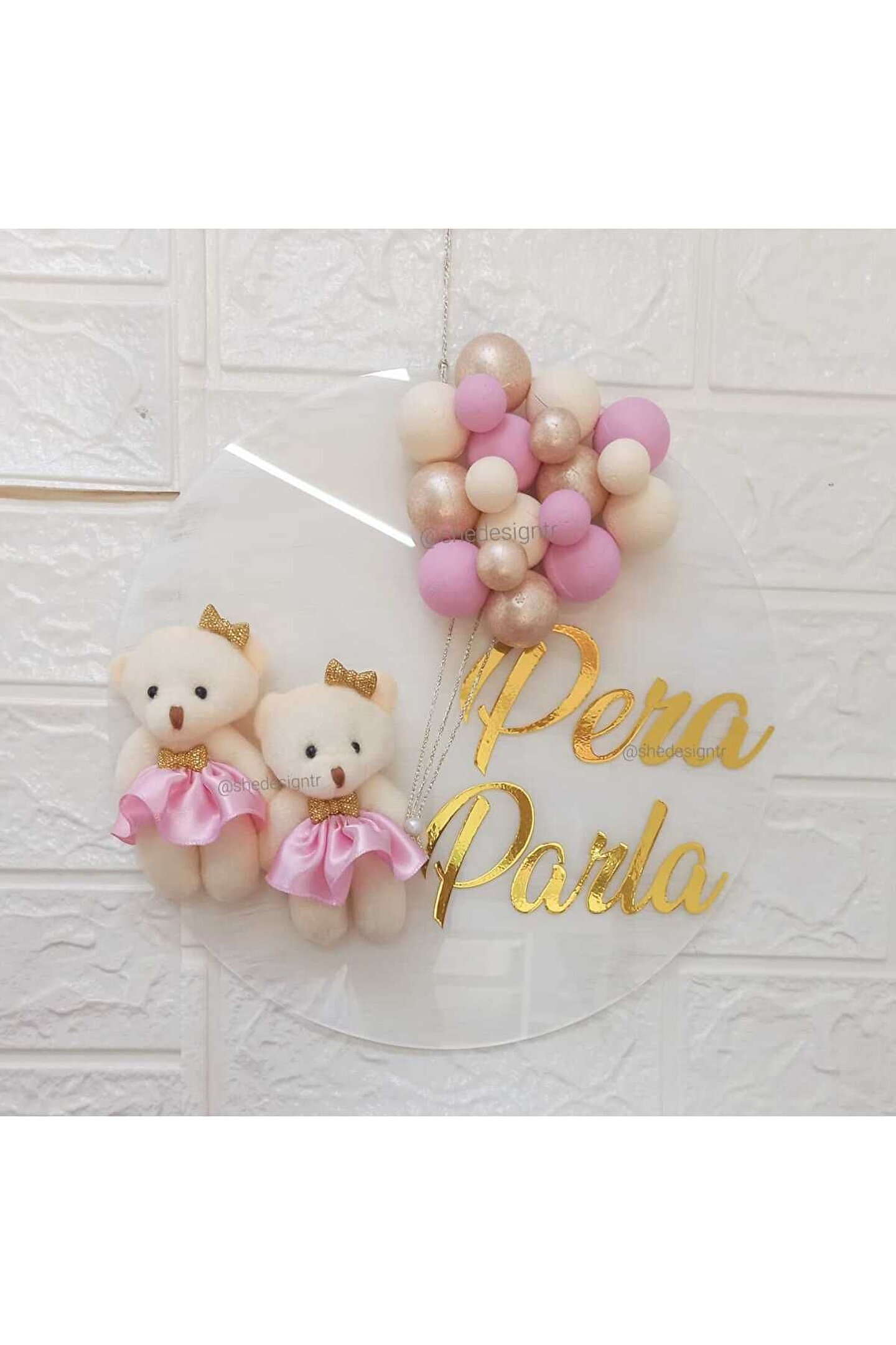 İkiz Kız Bebek Isme Özel Şeffaf Pleksi Kapı Süsü – Kız & Kız Bebek Için Özel Tasarım Bebek Ayıcıklı