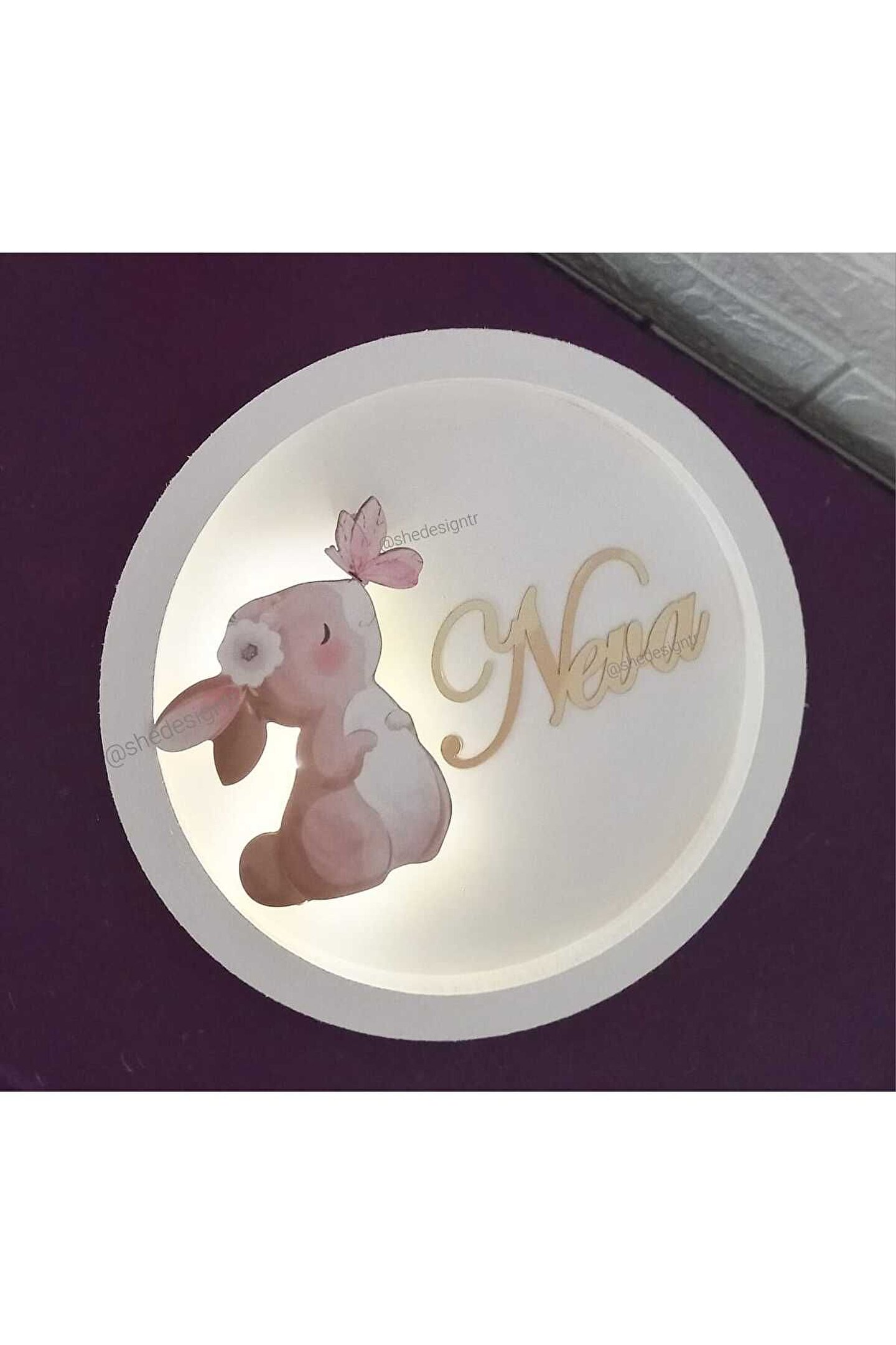 İsme Özel Hazırlanan Tavşanlı Ledli Ahşap Pano Yuvarlak Hastane Kapı Süsü