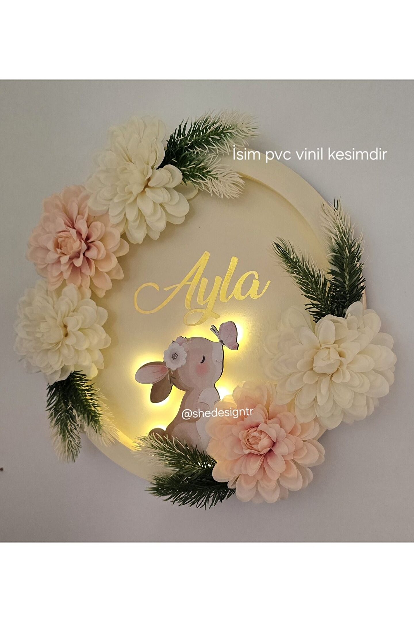 KIZ BEBEK İSMİNE ÖZEL HAZIRLANAN TAVŞANLI ÇİÇEKLİ PANO
