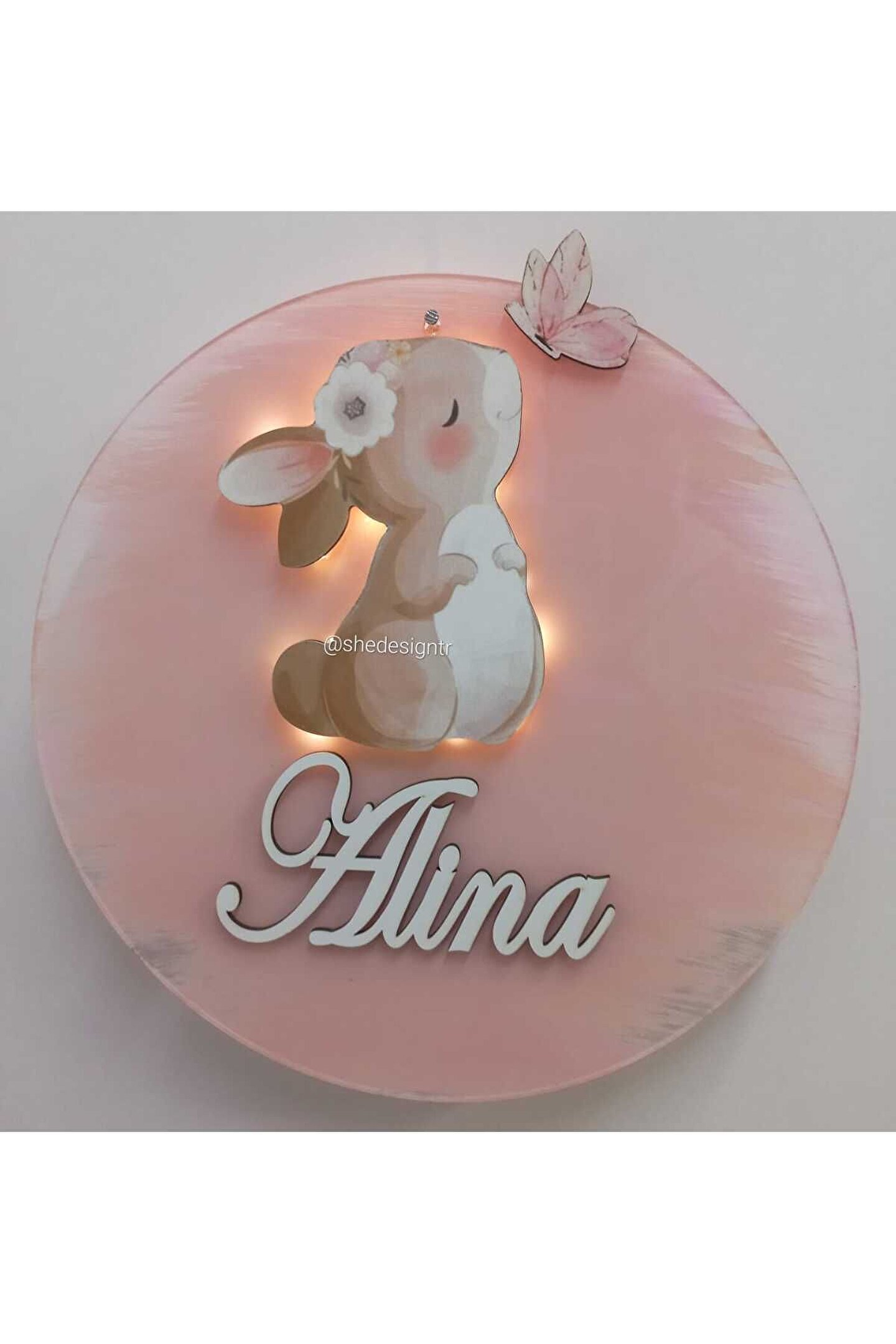 KIZ BEBEK İSMİNE ÖZEL HAZIRLANAN TAVŞANLI LEDLİ PLEKSİ KAPI SÜSÜ