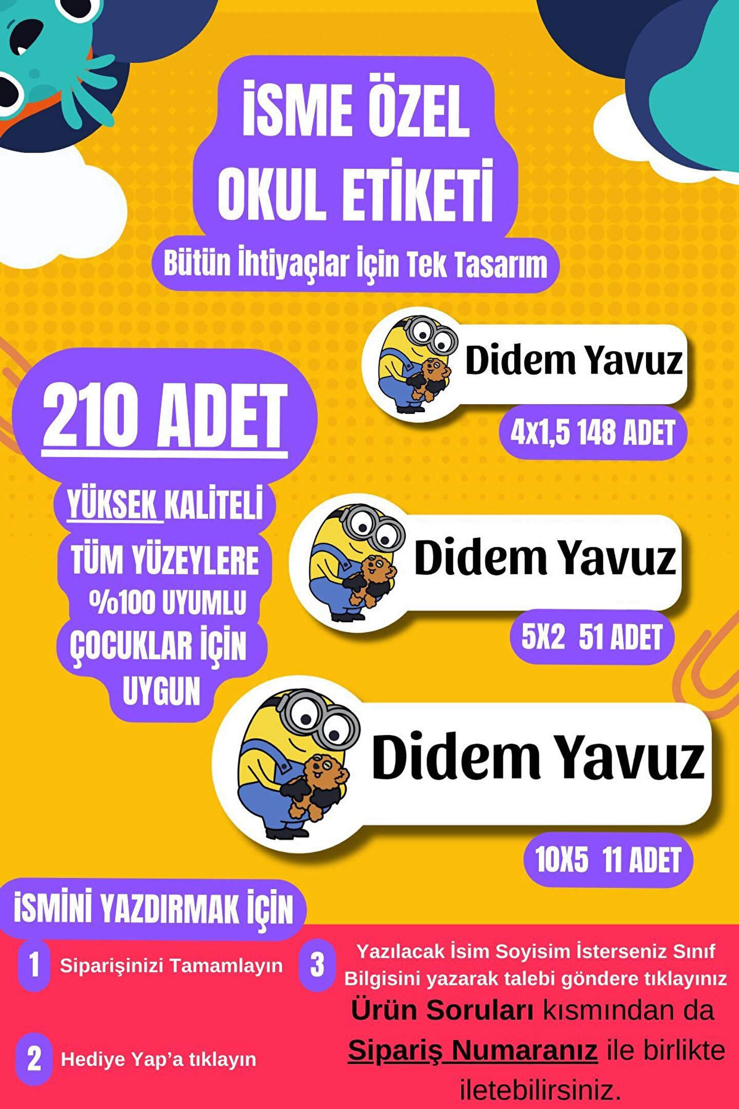 Okul Etiketi Özel İsimli Minyonlar Karekterli Defter Çanta Matara Kalem Kişiye Özel İsimli Yazılı