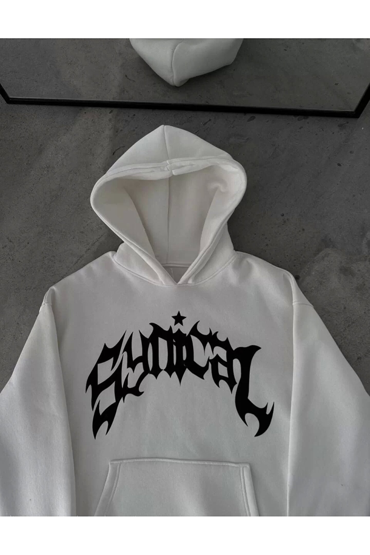 SA Alişveriş Dünyam Kışlık Kapüşonlu Baskılı Oversize SweatShirt- Beyaz
