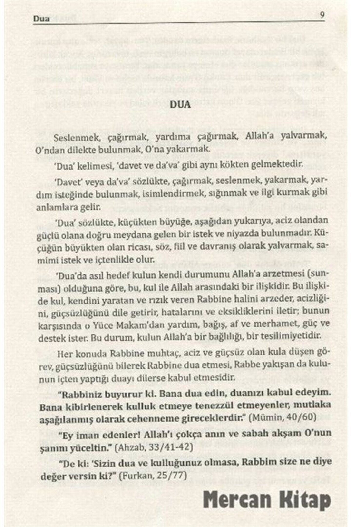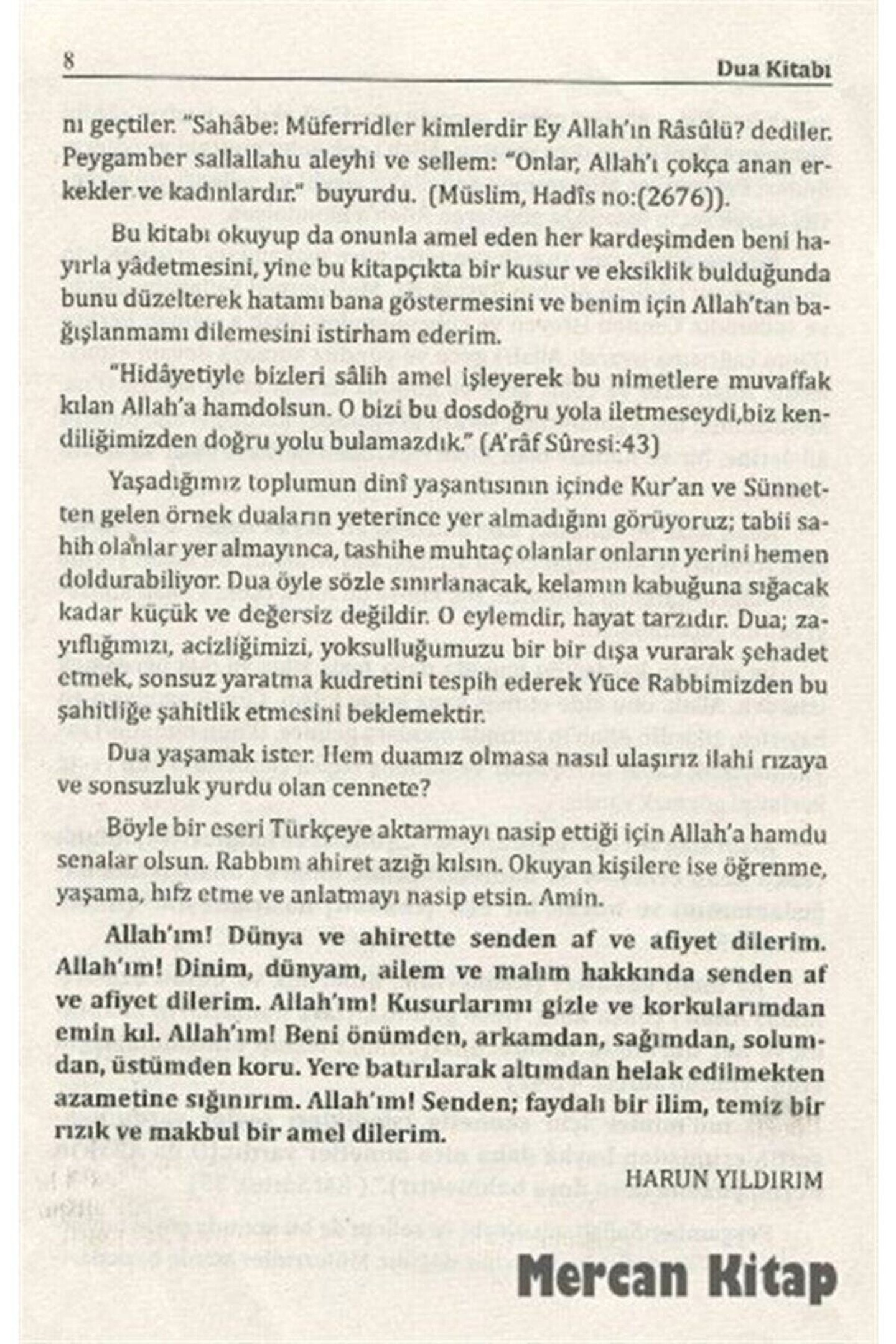 Ayet ve Hadislerle Sahih Dualar Dua ile Tedavi, Rukye İmam Nesai, İmam-ı Buhari, İbn Hacer el-Askalani, İmam Tirmizi, İmam Suyuti, Said el-Kahtani / Sağlam Yayınları Basım Yılı: 2012; Baskı: 1; Sayfa Sayısı: 495; Kağıt Türü: İthal Kağıt; Ebat: 16,5 x 24,5; Dil: Türkçe; Cilt Durumu: Ciltli; ISBN: 9759180744; Yazar: İmam Nesai, İmam-ı Buhari, İbn Hacer el-Askalani, İmam Tirmizi, İmam Suyuti, Said el-Kahtani, İmam Müslim, İbn-i Mace, İmam Muhyiddin en-Nevevi, İmam Hafız Ebu Davud; Çevirmen: Harun Yıldırım; Ayet ve Hadislerle Sahih Dualar "Dua bir İbadettir ibadetlerin özüdür. Tüm hayatı içine alıp kucaklayan bir ibadet olarak duanın en belirgin vasfı tevazudur. Ancak kibirden arınmış insanlar dua etmeye yanaşırlar. Yaratıcıya sunabilecekleri tek geçer akçedir dua. Çünkü O'nun katında malın-mülkün bir ömrün boş yere harcandığı uğrunda savaşlar verilen beşeri değerlerin bir kıymeti yoktur. Bizi O'nun katında değerli kılan ve rızasına yaklaştıran tek değerdir dua. Dua yaradılış gayesi olan ibadetin en önemli unsurlarından birirdir. Ve cinleri ve insanları yalnızca bana ibadet etmeleri için yarattım diyerek varoluş gayemizi beyan eden Rabbimiz şüphesiz aklı selim sahipleri için en doğru hedefi göstermiştir. Rabbiniz Buyuruyor ki Bana dua edin duanızı kabul edeyim. Bana kibirlenerek kulluk etmeye tenezzül etmeyenler mutlaka aşağılanmış olarak cehenneme gireceklerdir.'' (Mümin suresi 60) "Ey iman edenler! Allah'ı Çokça anın ve sabah akşam O'nun Şanını Yüceltin.'' (Ahzab suresi 41-42) "Deki: 'Sizin dua ve kulluğunuz olmasa Rabbim size ne diye değer versin ki?'' (Furkan suresi 77) Dua etmenin bazı edepleri ve kabul edilme sebepleri. Duanın Kabul edildiği yerler Haller ve Vakitler. Kitap ve Sünnetten dualar Kitap ve sünnetten rukye ile tedavi Kuran ve sünnet ile tedavinin önemi. Sihrin Tedavisi göz değmesi Nazar tedavisi Kendisine cin musallat olmuş kimsenin tedavisi nefsi (psikolojik) hastalıkların tedavisi yara ve çıban tedavisi başına bir musubet gelenin tedavisi hastanın kendisini tedavi etmesi uykusunda korkan ve kabus görenin tedavisi humma (ateşli hastalıkların) tedavisi böcek ve yılan sokmasının tedavisi öfkenin tedavisi çörekotu ile tedavi mal ile tedavi zem zemsuyu ile tedavi kalp hastalıklarının tedavisi vs. gibi... Kaynak gösterilen Kitaplar: Sahihi Buhari Sahihi Müslim Süneni Tirmizi Süneni Nesei Riyazus Salihin Süneni ebu Davud İbnu Mace Cami'ul Ehadis Metalibu Aliye Hisnul Müslim'den dua Rivayetleri.