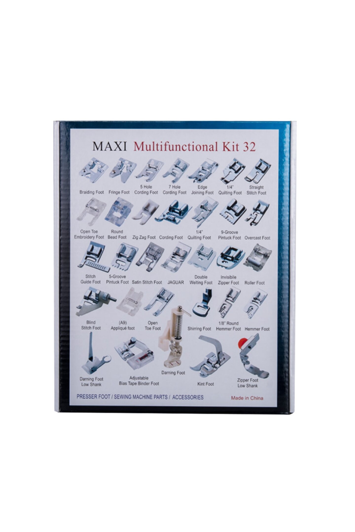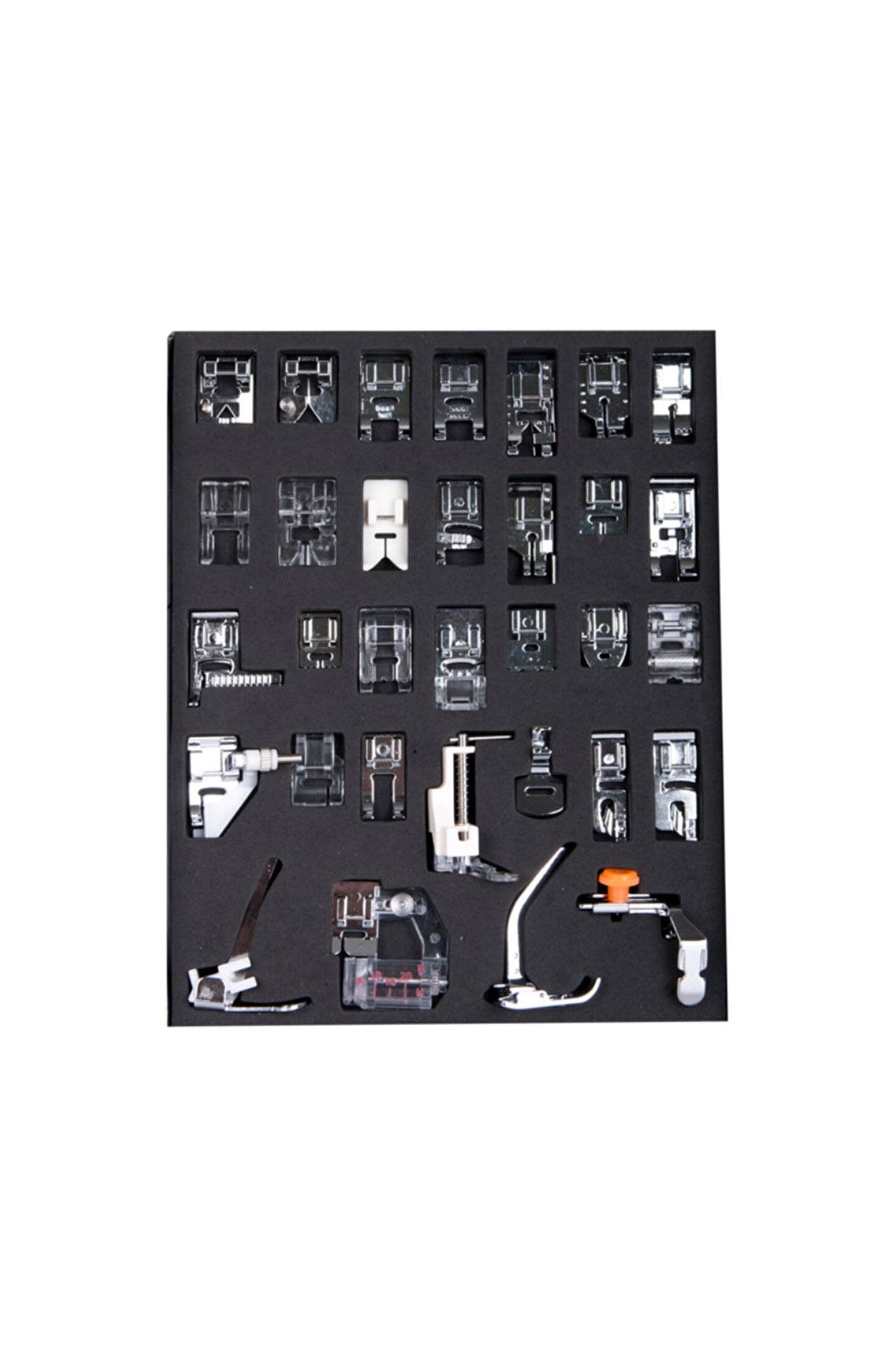 32 Parça Ev Tipi Dikiş Makine Ayak Seti KT-032 32 parça ev tipi dikiş makinesi ayak seti ; Ev tipi dikiş makineleri için uyumludur.; ; Sanayi tipi makinelere uymamaktadır.; ; 1 pakette 32 çeşit ayak bulunmaktadır.; ; Makinede değişiklik yapmadan farklı ayaklarla farklı teknik dikişleri sağlanabilmektedir.; ; 5mm zigzag genişliği olan ev tipi dikiş makineleri için uyumludur.; ; Singer, Janome, Brother, Zetina, Juki, Toyota Bernette vb.; birçok markanın 5 mm zigzag genişliğindeki makineleri ile uyumludur.; ; Pfaff ev tipi dikiş makinelerinde kullanbilmek için bir adet (Alçak tutucu) bağlantısına ihtiyaç duyulmaktadır.; ; Alçak tutucu bağlantısının arka kısmında bulunan düğme ile tutucu üzerinde bulunan ayak çıkartılarak yerine monte edilir.; ; 32 Parça Ayak Seti içerisinde bulunan ayak çeşitleri aşağıdaki gibidir.; ; Örgü ipi Dikiş Ayağı Saçaklama - Püskül Ayağı ; Kordon Ayağı 5 Delikli ; Kordon Ayağı 7 Delikli Kenar Birleştirme Ayağı ; Kırkyama Dikiş Ayağı ; Düz Dikiş Ayağı ; Aplike Açık Parmak Ayağı Şeffaf ; Boncuk Dikme Ayağı 4mm ; Teflon Dikiş Ayağı 5mm ; Kordon Dikiş Ayağı 3'lü ; Kırkyama Düz Dikiş Ayağı Siperli ; Nervür Ayağı 9 Kanallı ; Sürfile Overlok Dikiş Ayağı ; Nervür Ayağı 5 Kanallı ; Saten Dikiş Ayağı ; Kurdele / Pul Dikme Ayağı ; Fitil Ayağı 2 Kanallı ; Gizli Fermuar Ayağı Metal ; Deri Dikme Ayağı Tekerlekli ; Gizli Dikiş Ayağı Ayarlı ; Aplike Ayağı ; Aplike Açık Parmak Ayağı ; Örme - Kapitone - Serbest Nakış Ayağı ; Büzgü Ayağı Alçak Tutuculu ; Kıvırma Ayağı 3mm ; Kıvırma Ayağı 3mm (Geniş Taban) ; Kapitone Ayağı Alçak Tutuculu ; Biye Aparatlı Dikiş Ayağı ; Örme Triko Dikiş Ayağı ; Fermuar Ayağı Sağ-Sol Alçak Tutuculu Ayarlı ;