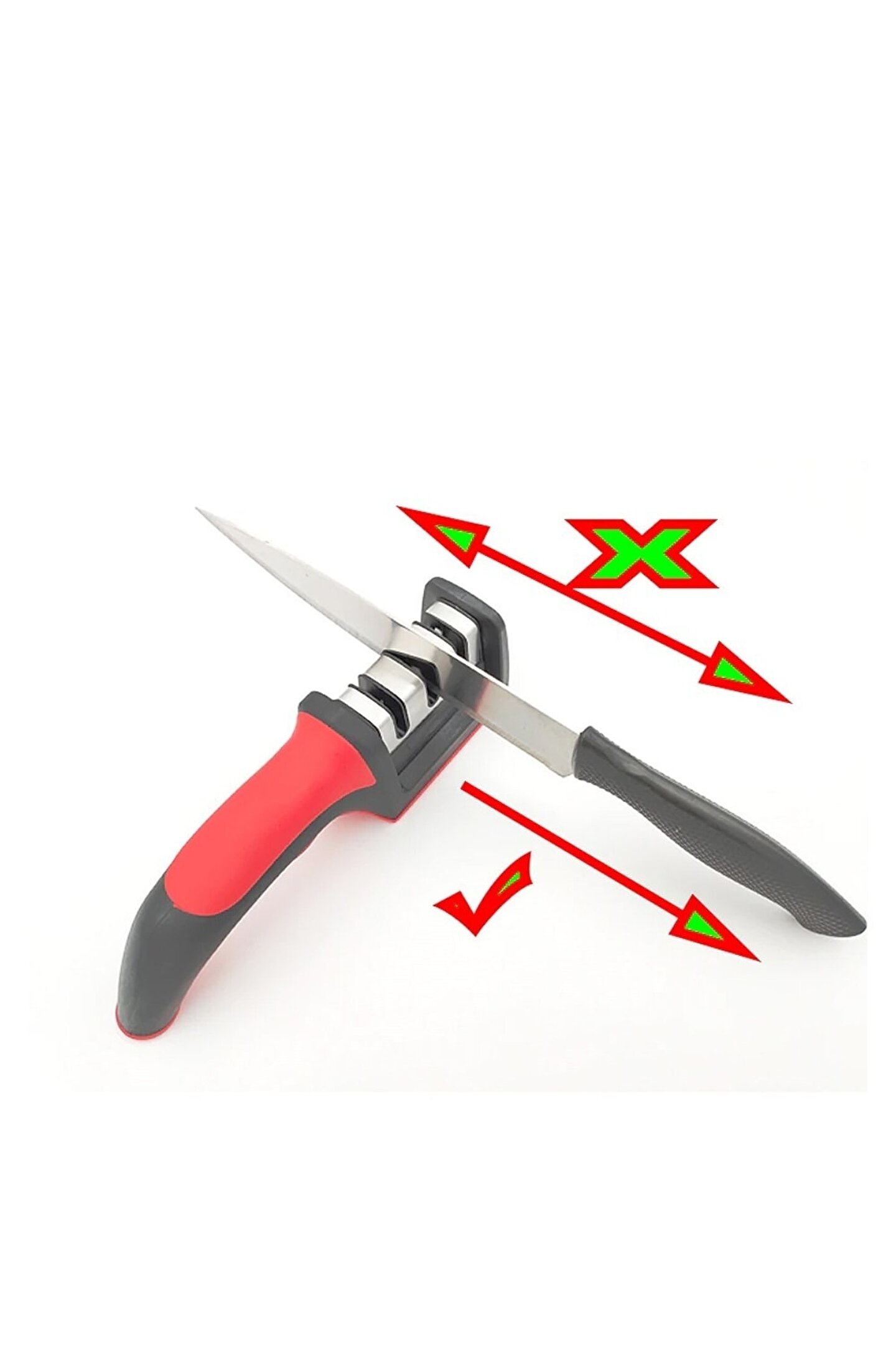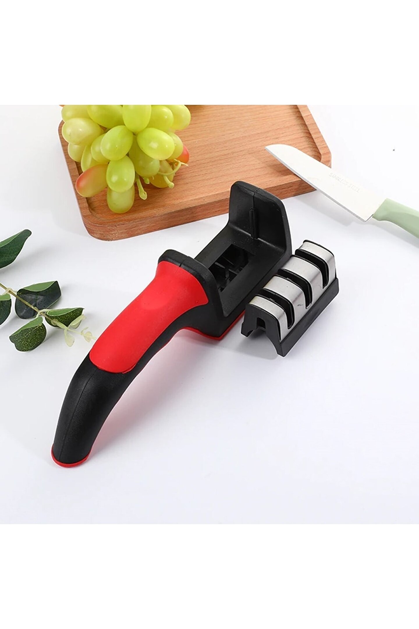 Şef saplı bıçak bileyici, ev tipi bileme aparatı Güvenliği sağlamak için kaydırmaz silikon taban ile silikon yüzey kaymaz sap yapısına sahiptir. ; Bu sayede hem kaba hem de ince bileme keskinleştirme işlemlerinizi yapmak çok kolay. ; 3 bileme bölümü sayesinde ağzı bozulmuş bıçaklarınızı düzeltebilir, keskinlik oranını ayarlayabilirsiniz. ; Ürünün boyutu uzunluk 21 cm x yükseklik 5,7 cm x genişlik 5 cm paket içeriği1 adet - Bıçak bileyici;