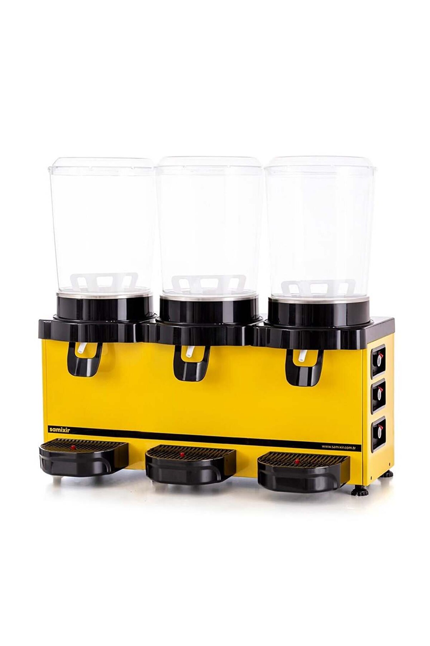 Samixir Triple Panoramik Analog 30 Lt Soğutuculu İçecek Makinesi - Sarı 2 Yıl üretici garantili.; CE Belgeli üretim.; Geniş soğutma tabanı sayesinde içecekler daha hızlı ve son damlasına kadar eşit olarak soğur.; Bu sayede klasik ürünlere göre %50’ye varan enerji tasarrufu sağlar.; Hazneler soğutma ve karıştırma konularında birbirlerinden bağımsız kontrol edilebilir, çoklu hazne sayesinde her an içecek temini sağlanabilir.; Pratik musluk sistemi; tek el kullanılarak rahatça içecek alabilmeyi sağlar.; Geniş musluk hortumu parçacıklı içeceklerde bile hızlı dolum sağlar ve kolaylıkla sökülüp temizlenebilir.; Manyetik palet sistemi sayesinde hazne içinde bulunan içeceğin alt motor bölümüne sızma riski ortadan kalkar, bu sayede motorun ömrü uzar.; Burgulu palet sistemi homojen bir karışım ve içeceğin daha hızlı soğumasını sağlar.; Mükemmel temizlik ve hijyen için içecekle temas eden tüm parçalara kolayca ulaşılır ve hızlı bir şekilde temizlenebilir.; Polikarbonat hazne darbeye dayanıklı ve gıda kullanımına uygundur.; Tek gövde ve üçlü hazne sayesinde farklı ve çeşitli içecekleri aynı anda sunmak isteyen işletmelere uygundur.; Damlalıkta bulunan seviye göstergesi sayesinde atık suyun taşmadan önce boşaltılması gerektiği rahatlıkla fark edilir.; Teknik Özellikler Hazne Kapasitesi 10L + 10L + 10L Akım 1,53 A Soğutucu Gaz R134A / R290 Ağırlık ve Ölçüler Makine Koli Sıcaklık Aralığı +3 °C — +10 °C Ağırlık 29 kg 32,5 kg Enerji Tüketimi 5 kWh/24h Genişlik 750 mm 780 mm Güç 300 W Derinlik 390 mm* 355 mm Soğutma Gücü 750 W Yükseklik 700 mm 720 mm Besleme Voltajı 220-240 V 50 Hz * damlalık dahil Opsiyonel Voltaj 208-220 V 60 Hz Opsiyonel Voltaj 115 V 60 Hz