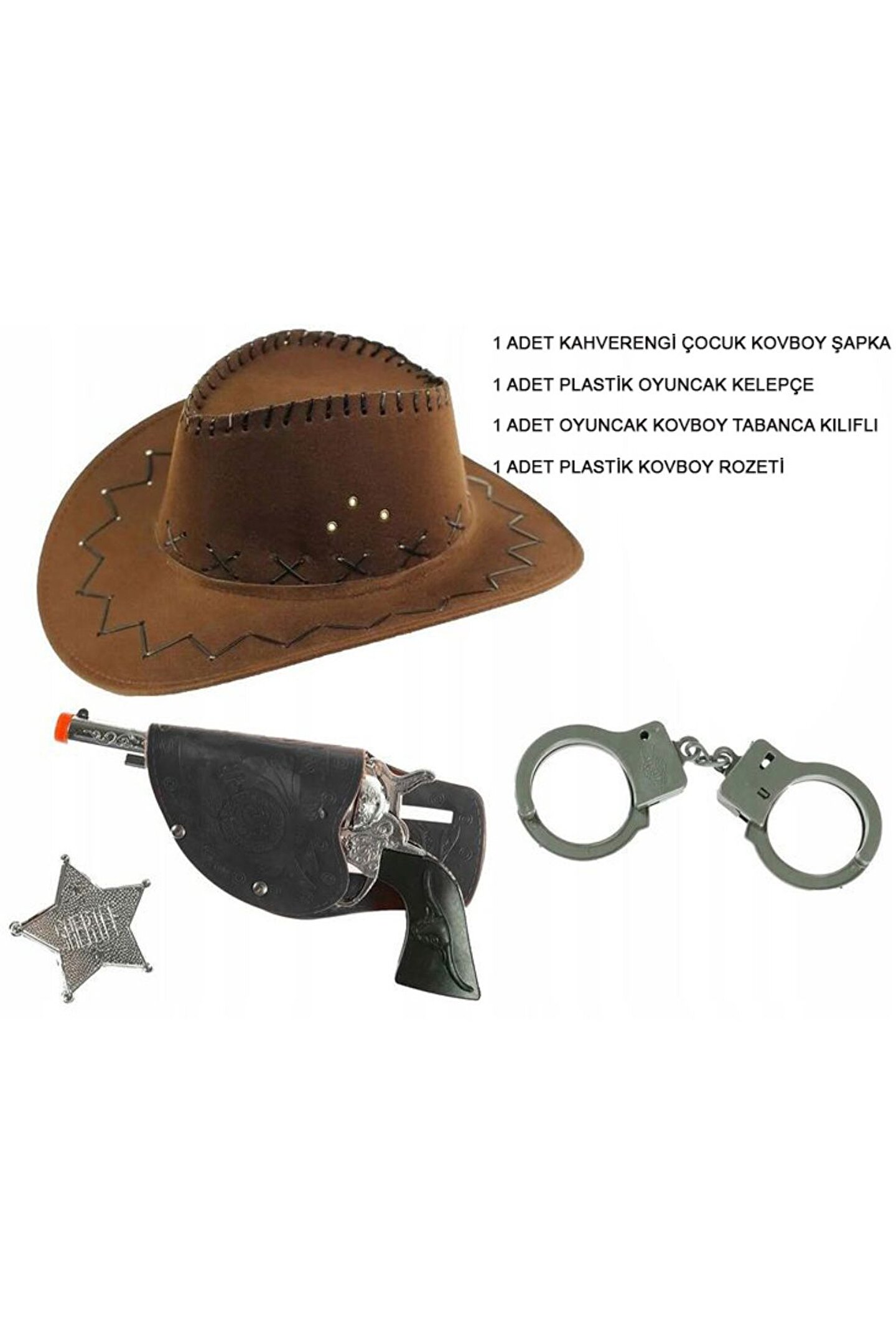 Çocuk Boy Kahverengi Kovboy Şapka Tabanca Rozet ve Kelepçe Seti