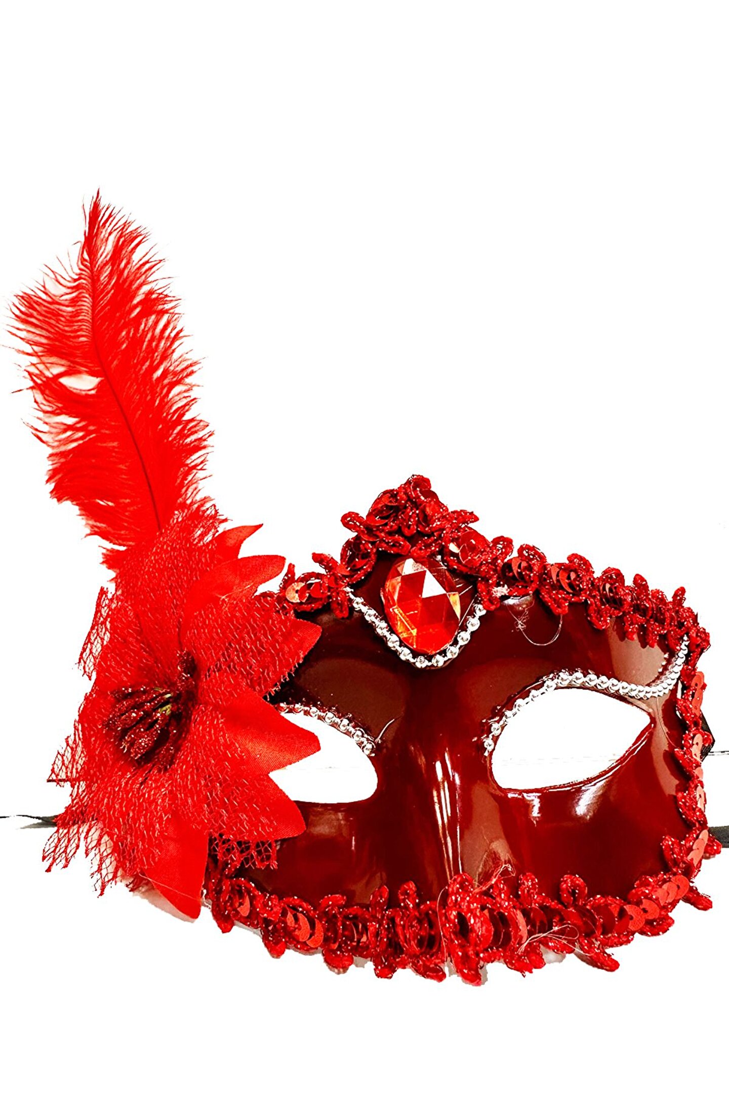 Kırmızı Mat Renk Yandan Tüylü Güllü Parti Balo Venedik Maskesi 16x22