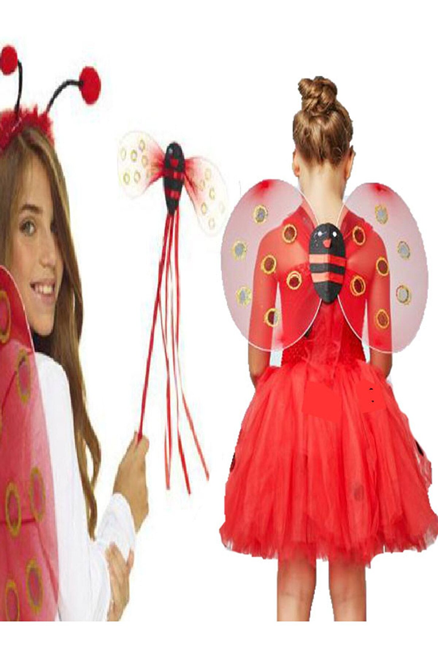 Kırmızı Renk Uğur Böceği Kanadı Eteği Tacı ve Sopası 4 lü Kostüm Seti