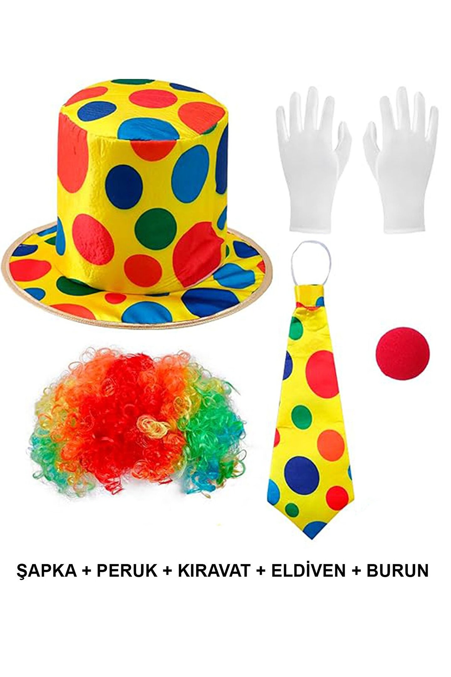 Renkli Palyaço Kostüm Seti – 5 Parça Aksesuar (Şapka, Peruk, Kra