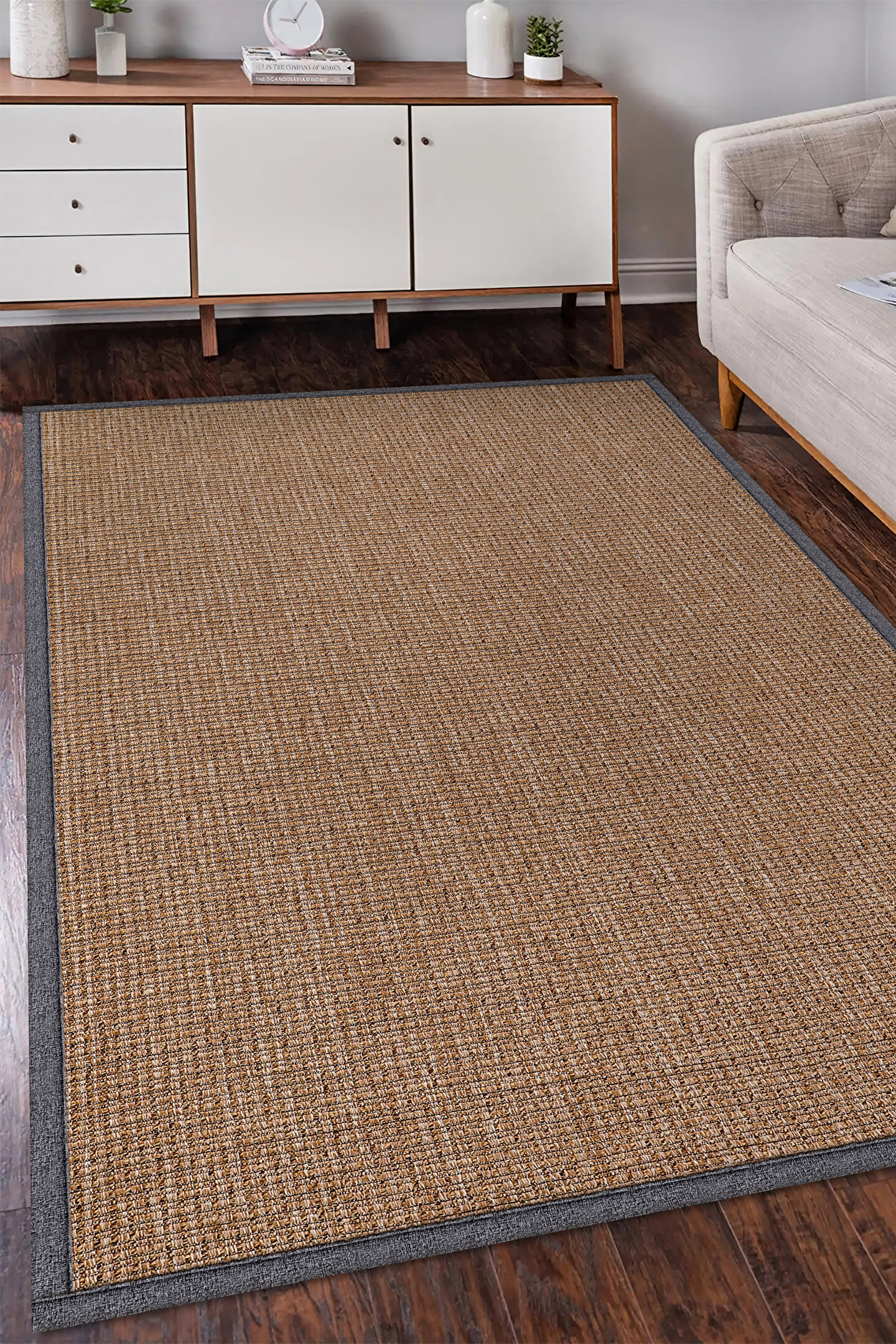 SARAZ HALI 0465-Gri Kumaş Bordür Sisal Jut Halı Kilim Hav Toz Vermez Kolay Temizlenen Hasır Kilim