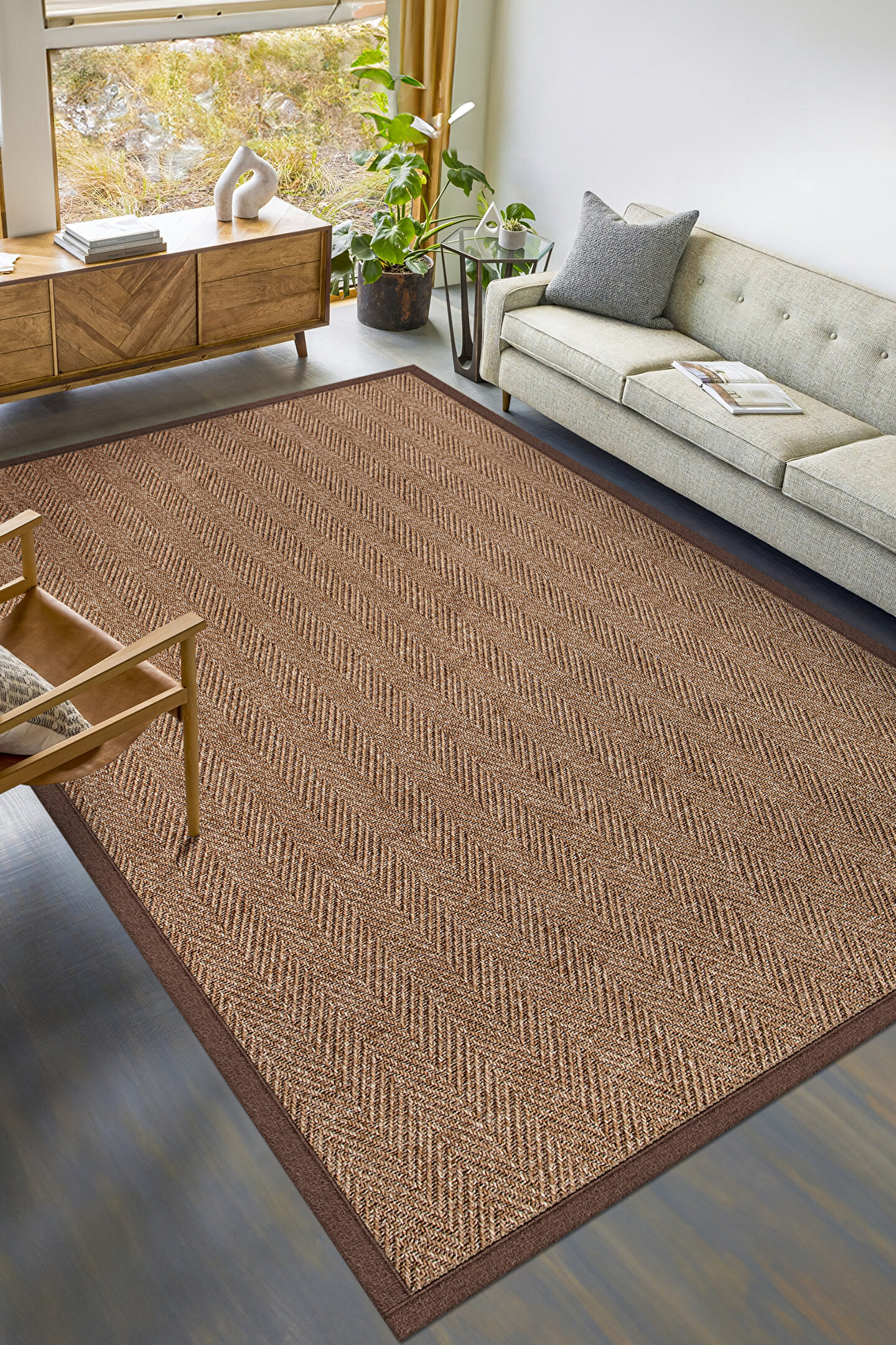 SARAZ HALI 0503-Kahve Kumaş Bordür Sisal Halı Kilim Hav Toz Vermez Kolay Temizlenen Hasır Kilim