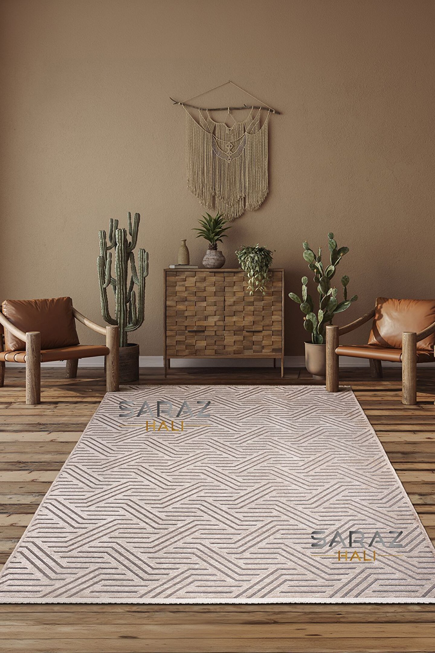 SARAZ HALI Ada Kilim Modern Salon Mutfak Koridor Kesme Yolluk Dokuma Makine Halısı zigzag krem