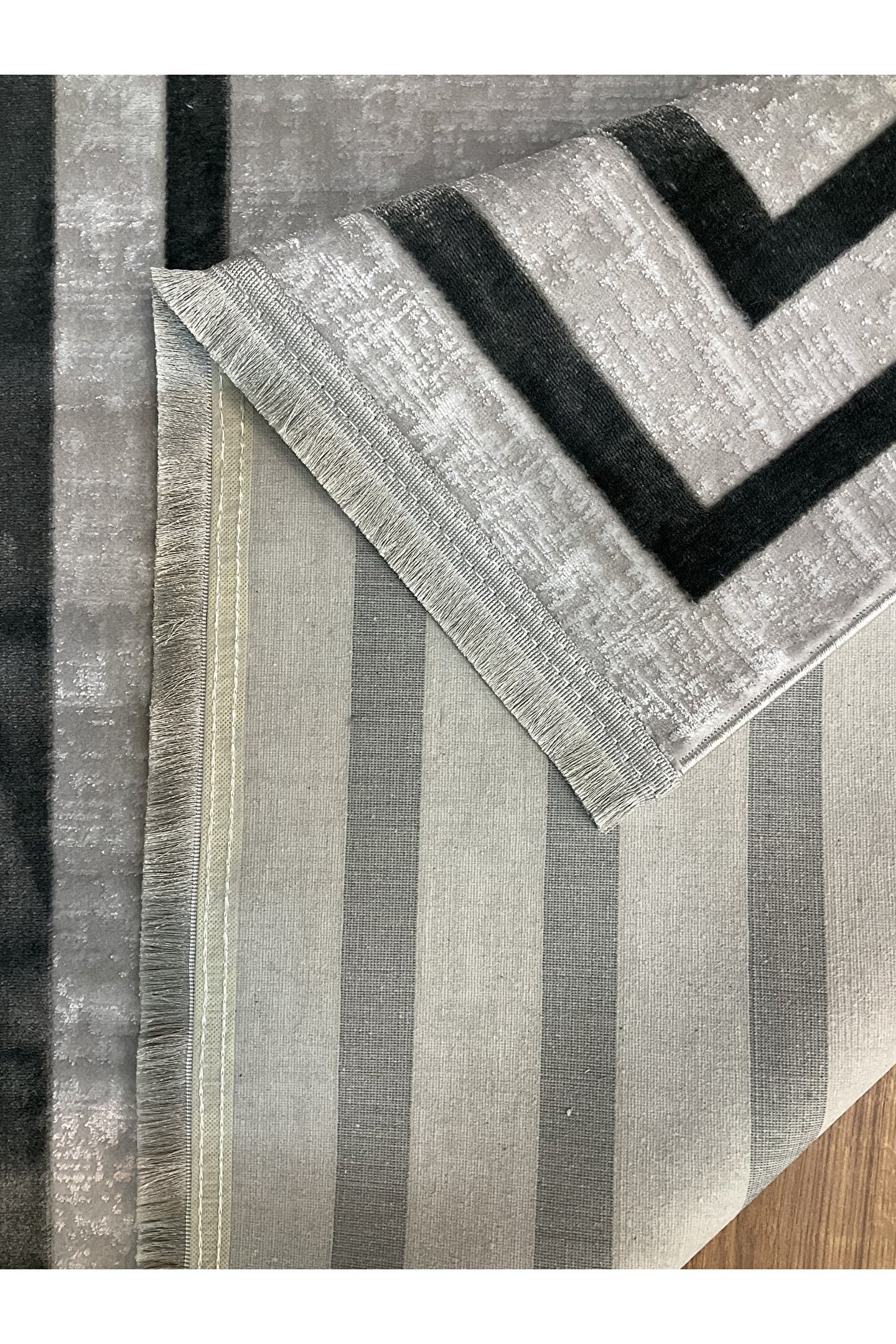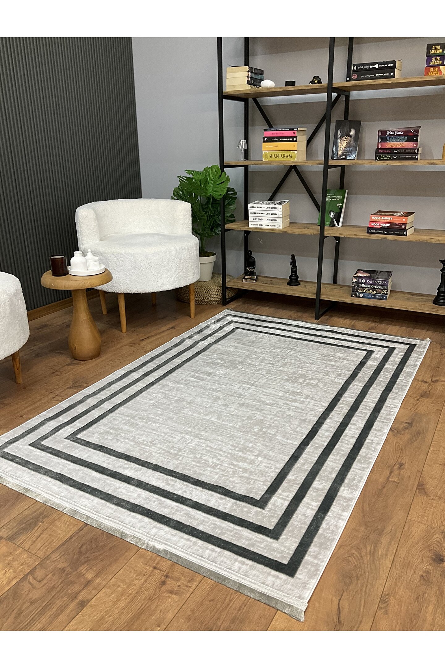 SARAZ HALI Çerçeve Model Bambu Yıkanabilir Parlak Halı Gri Çizgi