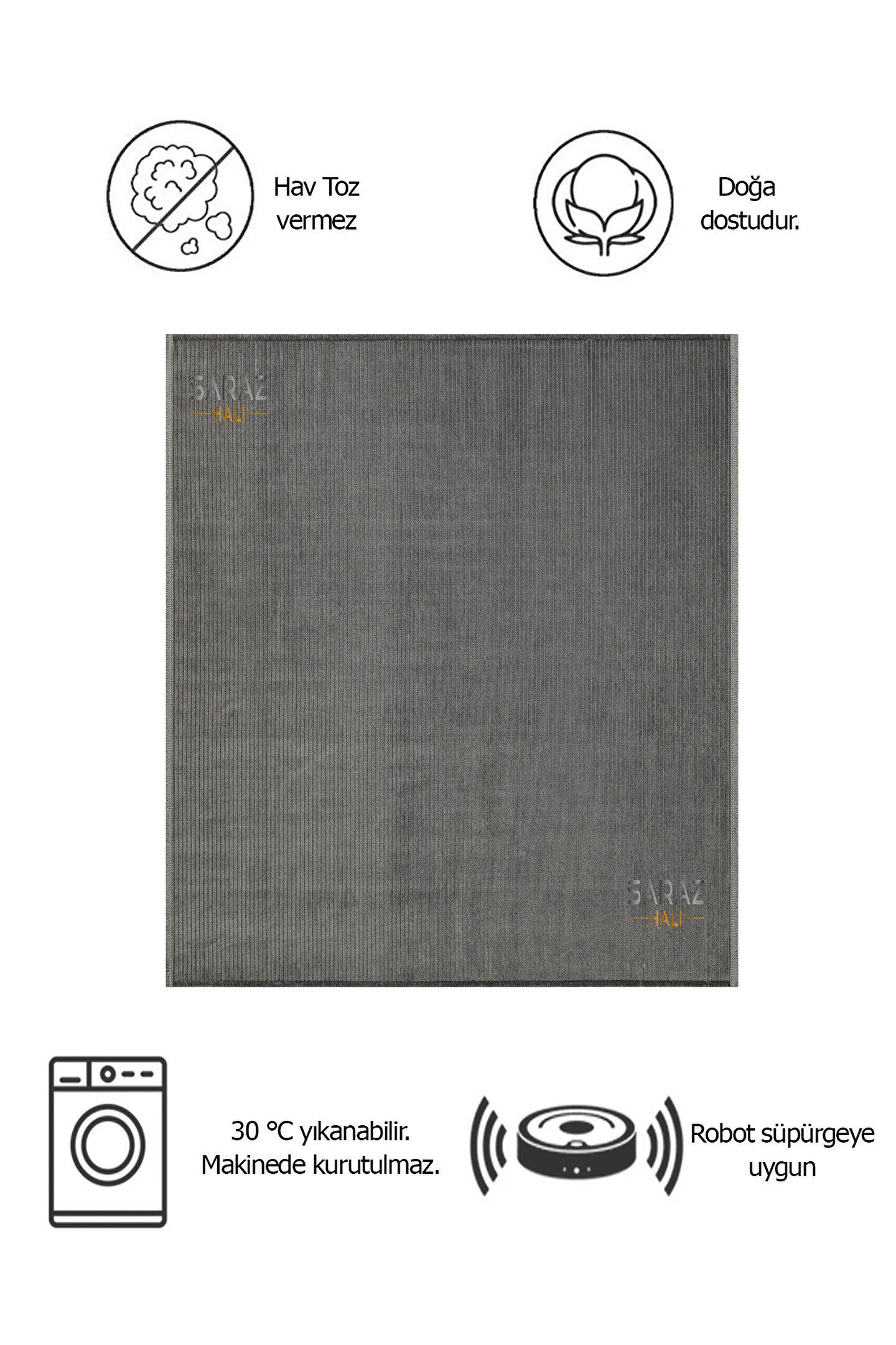 SARAZ HALI Dizayn Şönil Dokuma Kayma Yapmaz Makinede Yıkanabilir Leke Tutmaz Kesme Bohem Kilim Antrasit