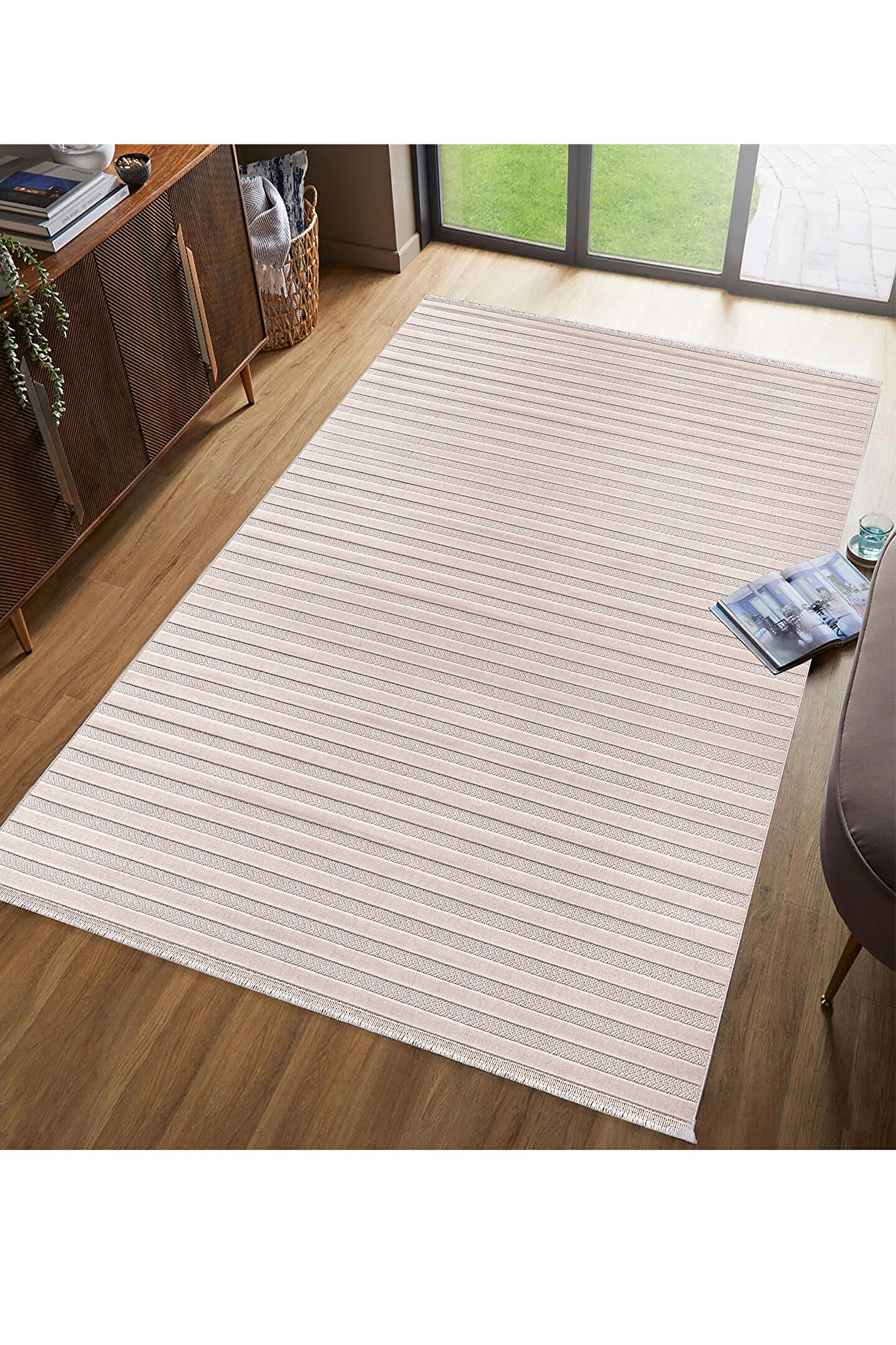 SARAZ HALI Kadife Bambu Dokuma Modern Kaymaz Salon Halısı Mutfak Halısı Koridor Halısı Yolluk Çizgi Bej