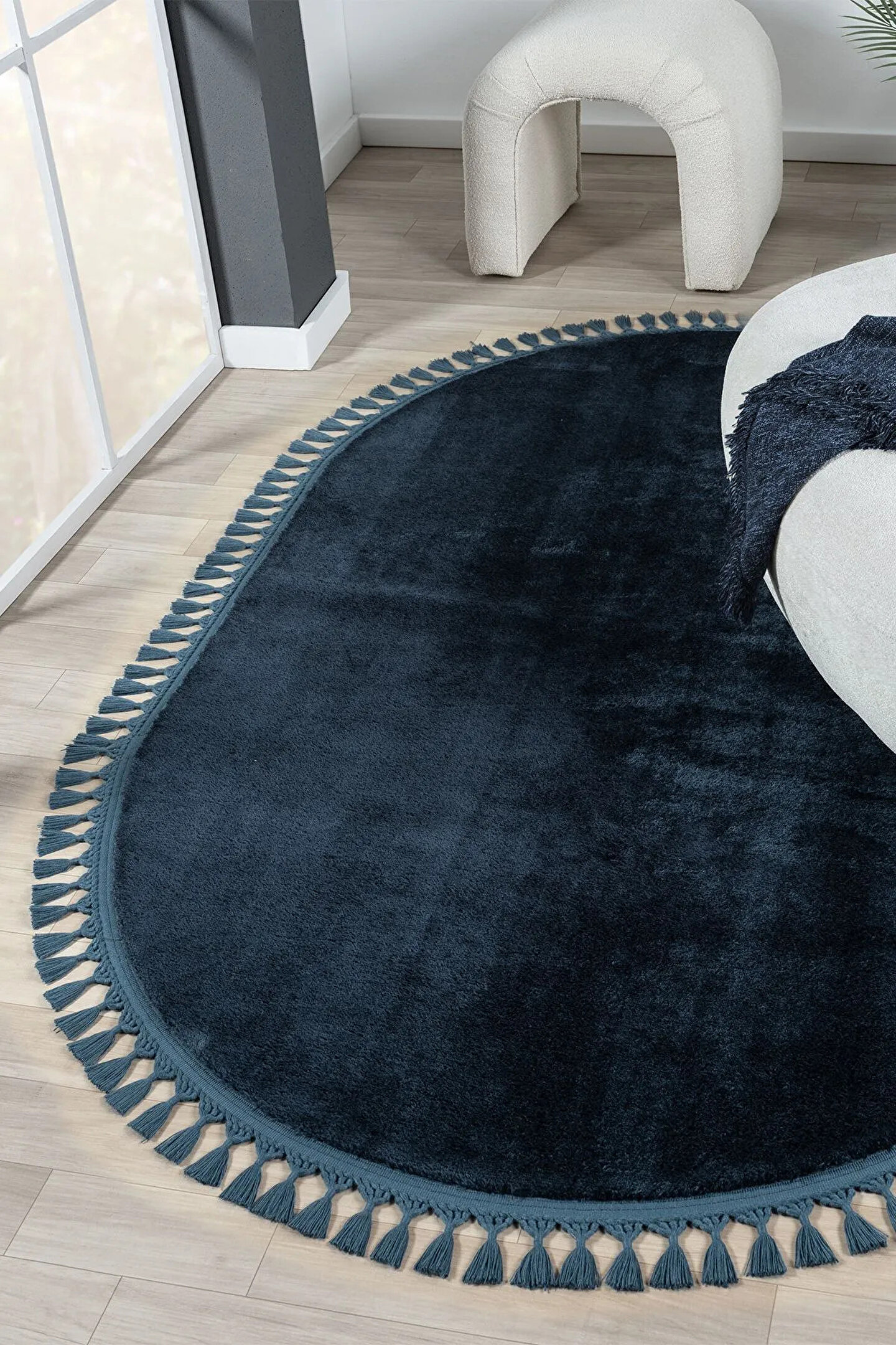 SARAZ HALI Puffy Antrasit Oval Örgü Saçaklı Peluş Yumuşacık Yıkanabilir Kaymaz Taban Halı Salon Oturma Odası