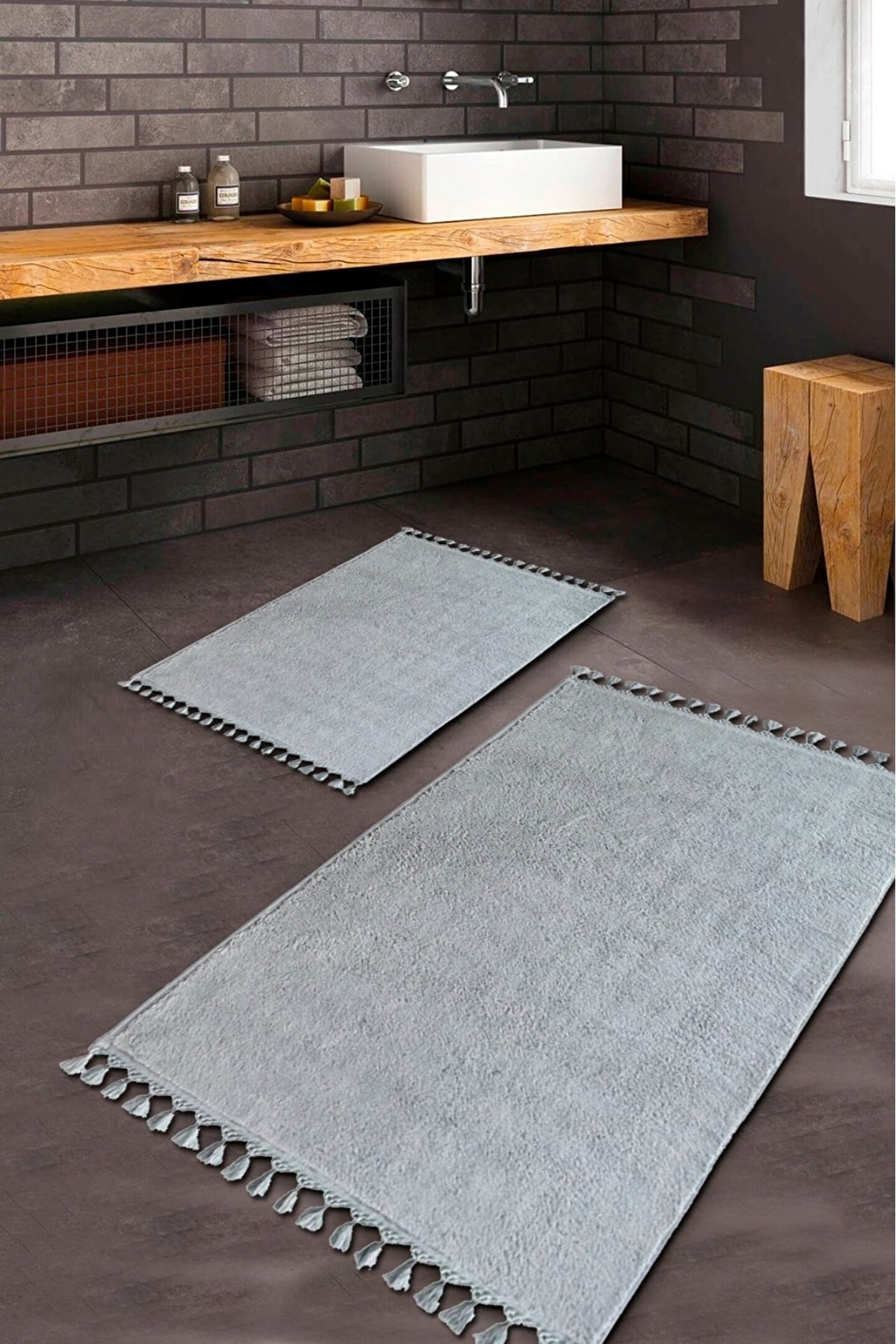 SARAZ HALI Puffy Banyo Paspas 2 Li Saçaklı Yıkanabilir Gri