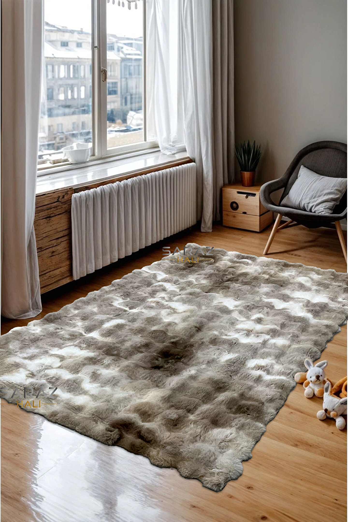 SARAZ HALI Renkli Bubble Tavşan Tüyü İthal Kaymaz Yumuşak Tüylü Tona Ton Kahverengi