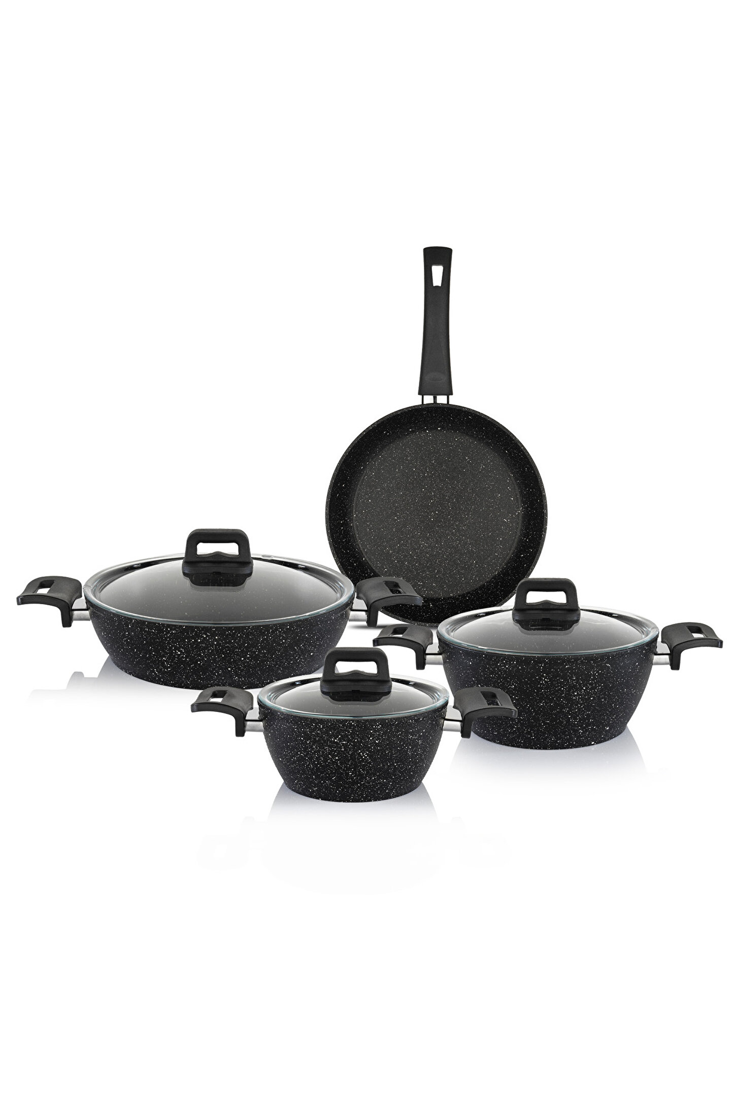 Schafer Savor Yanmaz Yapışmaz 7 Parça Siyah Tencere Seti-Isıyı eşit ileten alüminyum gövde üzerine güçlendirilmiş granit kaplama,-Ergonomik bakalit kulplar sayesinde tutulabilir kolaylığı ve el yakmaz özelliği,-Yanmaz yapışmaz özel kaplaması sayesinde pişirme ve temizleme kolaylığı,-Bulaşık makinesinde yıkanabilir.; Daha uzun ömürlü olması için elde yıkanması tavsiye edilir.; -Ocak tipi: Gaz, Elektrik, Halojen, SeramikÜrün içeriği;-18cm tencere derin tencere + Kapak-22cm tencere derin tencere + Kapak-26cm tencere sığ tencere + Kapak-26cm Tava* (Almış olduğunuz ürün parça garantili olup kırılan parçalar firmamız tarafından temin edilecektir.; *Ürün etmeden önce firmamız ile iletişime geçe bilirsiniz.; )