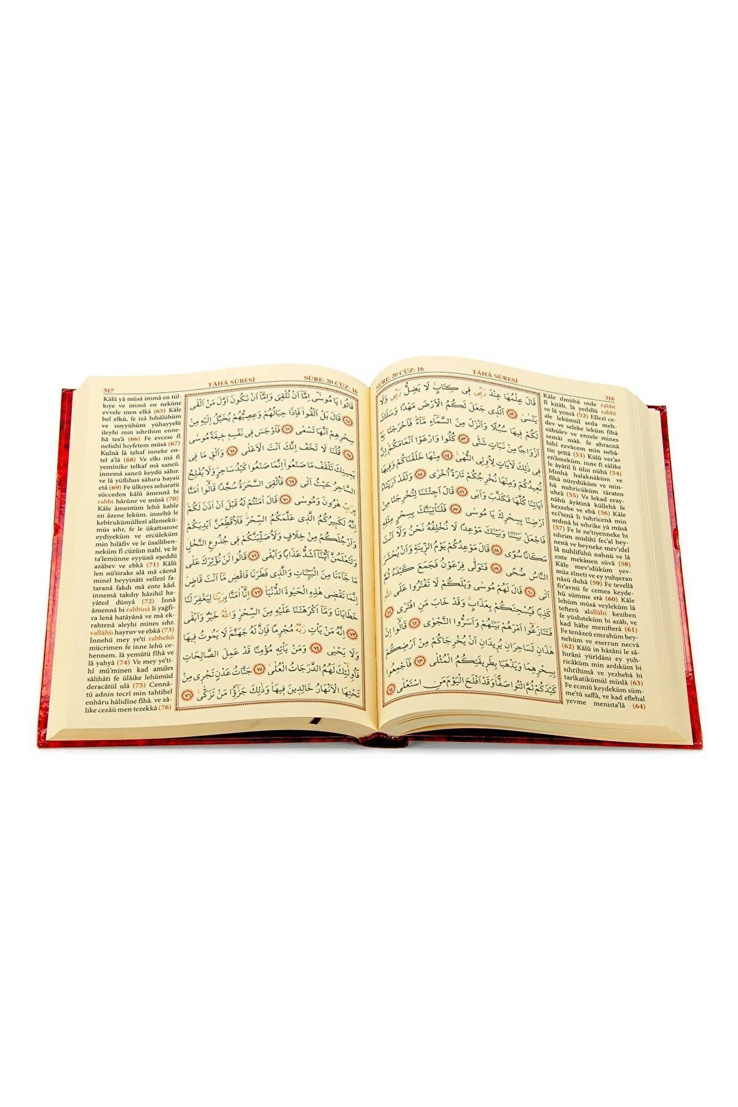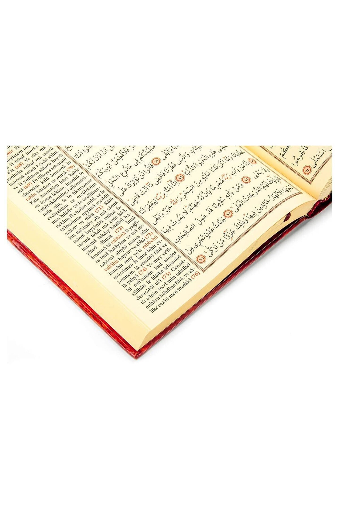 RAHLE BOY, İKİ RENKLİ, TÜRKÇE OKUNUŞLU KURANI KERİM ÖZELLİKLERİ Basım Yılı: 2009; Sayfa Sayısı: 630; Kağıt Türü: Şamuha Kağıt; Ebat: 20 x 28 cm; Dil: Arapça - Türkçe; Cilt Durumu: Ciltli; 1,426 gr. TÜRKÇE OKUNUŞ HAKKINDA ÖNEMLİ AÇIKLAMA Kuranı Kerîm harflerinin bire bir türkçe karşılığı bulunmamaktadır. Türkçe okunuş, Kurân-ı kendi dilinden okurken nasıl okunduğu hakkında şüphe duyduğunuz durumlarda yardımcı olması için konulmuştur. Kur'an-ı Kerimi Türkçe yazılışından okumak, kesinlikle anlamın değişmesine sebep olmaktadır. Bu nedenle türkçe harflerde olmayan bazı özel karakterler kullanılmıştır. Kuran harflerinin ne şekilde telaffuz edildiğini yetkili kişilerden öğrenebilirsiniz. Bu Mushaf-ı Şerif metni; bilgisayar ortamında, med ve kasırlı olarak, hat kâidelerine uygun bir şekilde, sayfa tutar bir halde,T.C. Diyanet işleri Başkanlığı tarafından mühür verilip ve onaylanan Hafız Osman hattı esas alınarak hazırlanmış ve ilmi bir heyet tarafından tashih ve tetkik edilmiştir. Bu eserin basım, yayım hakları SEDA YAYINCILIK'a aittir.