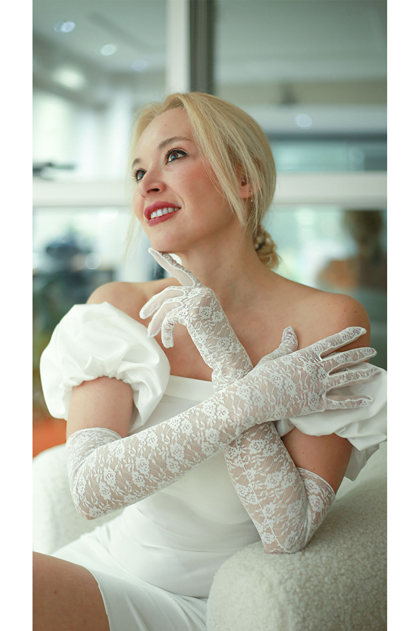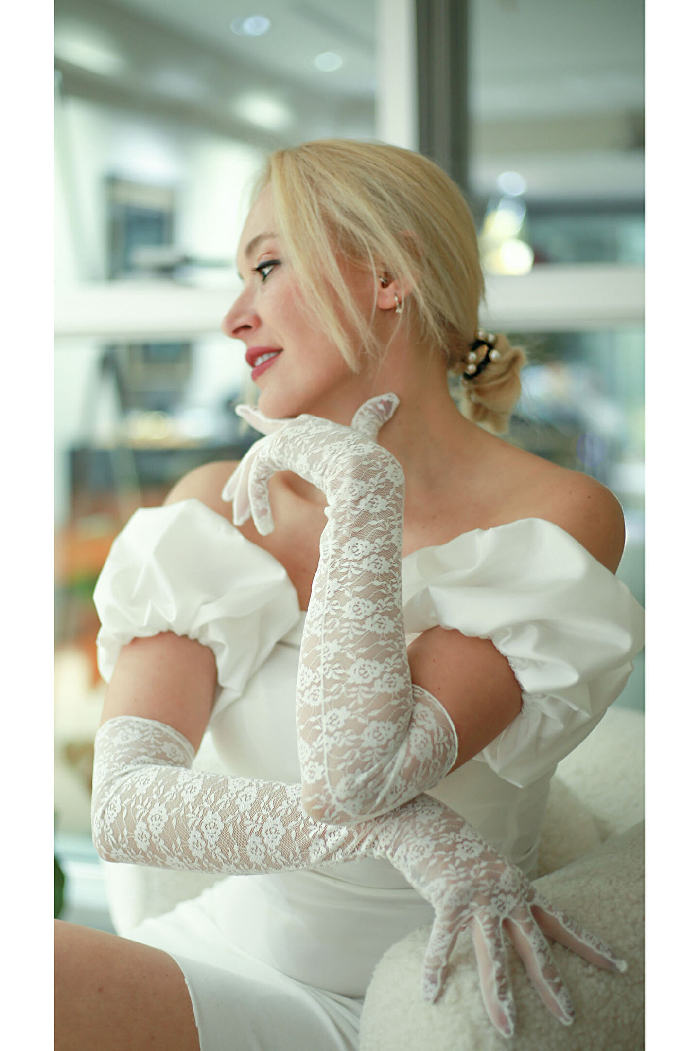 Zarif dantel detaylarıyla süslenmiş, şıklığı ve zarafeti ön plana çıkaran uzun beyaz gelin eldiveni; Klasik siyah rengiyle her türlü gelinlik ve aksesuarla uyum sağlayarak, özel gününüzde göz alıcı bir görünüm sunar; Dantelin ince dokusu ve zarafeti, eldiveninize sofistike bir hava katarken, siyah rengin asaletini tamamlar;