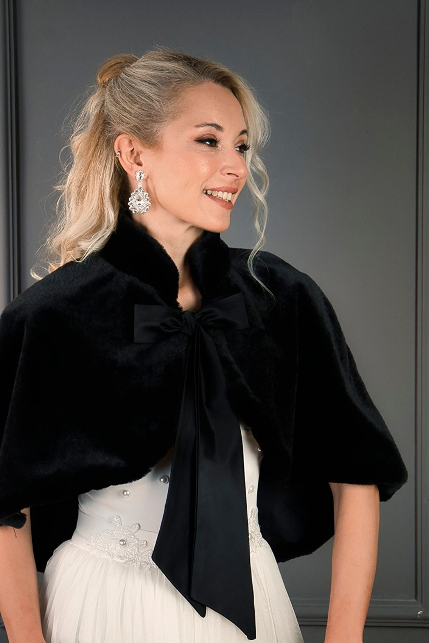 Uzun Fiyonklu Kürk Etol Gelin Bolero Şal Davet Panço Ceket Siyah