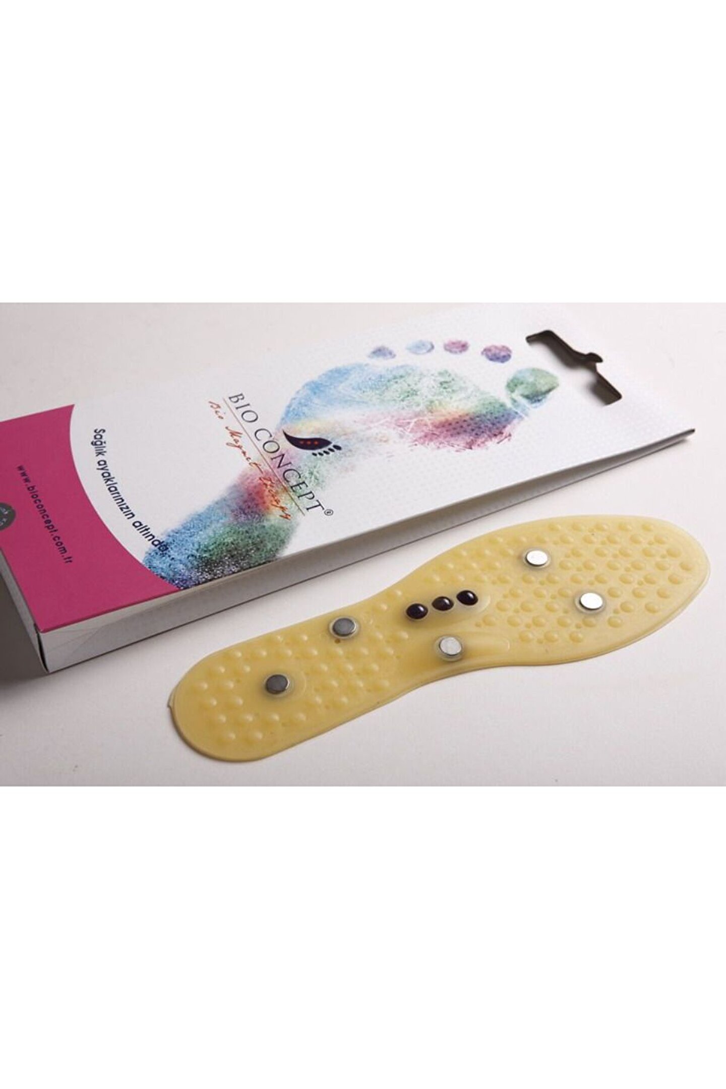 Medikaltec Bio Concept Tabanlık Baylar İçin 40-45 Numara Ayak Strese ve yorgunluğa son verir Yaşlılar, sporcular, uzun süre ayakta kalan ve sürekli yürüyenler, ayak ağrısı çekenler ve şeker hastaları için idealdir Antistatik özelliği sayesinde vücuttaki birçok rahatsızlık tedavisine yardımcı olur, vücuda pozitif enerji verir. . Baskıyı azaltır, nasır oluşumunu önler. Tabanlığın dizayn şekli ve mıknatısların özelliğinden dolayı ayak vücut yorgunluğu ve ağrıların giderilmesine yardımcı olur. Gözenekli esnek yapıya sahip olduğundan yürüme esnasında körük gibi havayı sirküle eder ve ayağa nefes aldırır. Ayağın boşluğunu alarak rahat etmesini sağlar. Ayağı sıcak havalarda serin, soğuk havalarda sıcak tutar. Toksik değildir, cilde zarar vermez ve sekiz ağır metali üretmez. %100 silikondan yapılmış olan özel mıknatıslı tabanlık, Silikon ve Neodyum mıknatısın bir arada kullanıldığı dünyadaki tek tabanlıktır. Ayağın anatomik yapısına göre üretilmiştir. Her tip ayakkabıya uyacak şekilde numaralı bölümler kesilerek ayarlanabilir. Bio Concept mıknatıslı silikon tabanlarının insan sağlığına zararlı hiçbir etkisi yoktur.