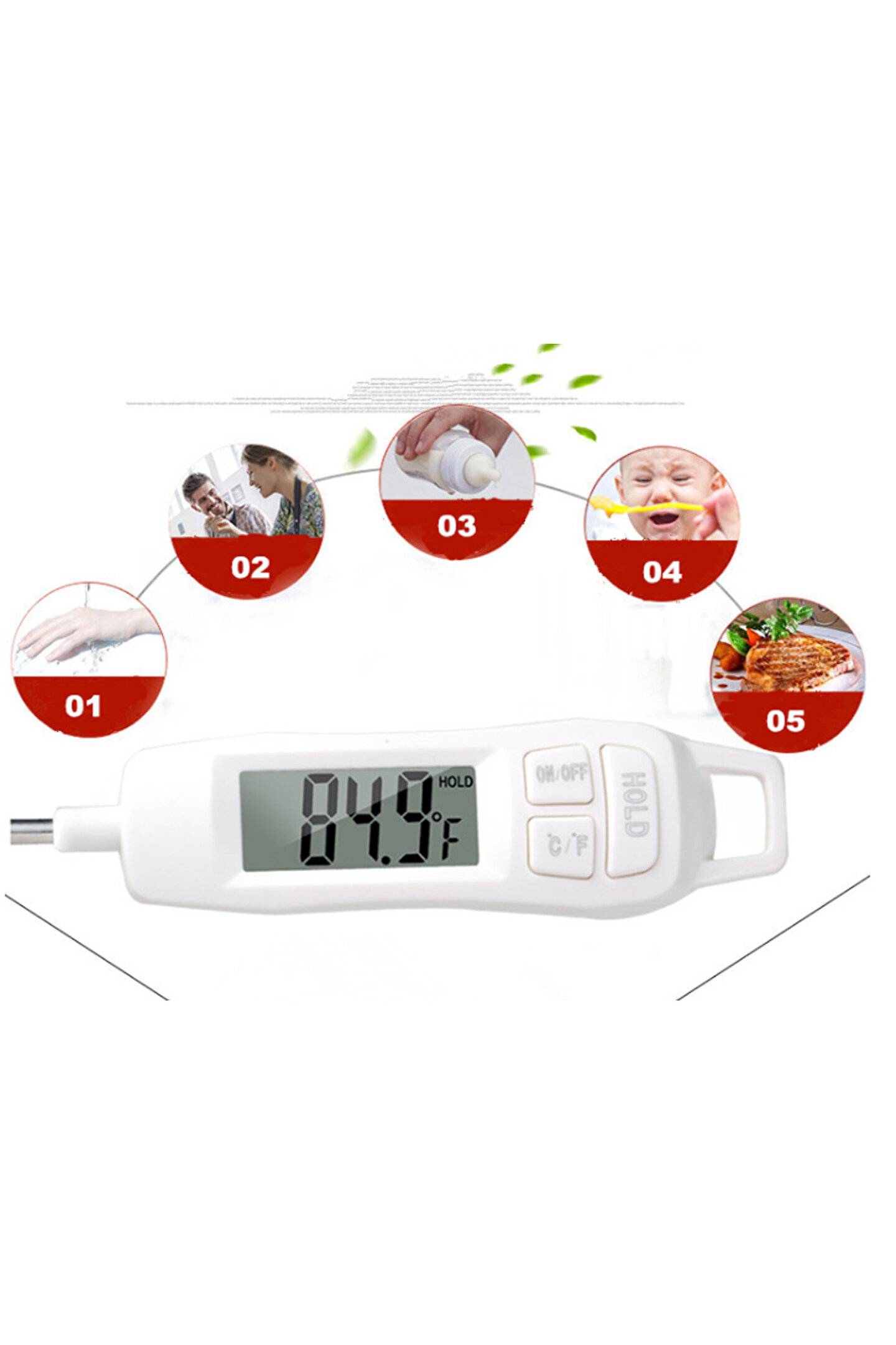 Vzn TP400 Termometre Sıvı Gıda Et Su Yiyecek Sıcaklık Ölçer VZN TP400 Termometre Sıvı Gıda Et Su Yiyecek Sıcaklık Ölçer Bu kalem tarzı dijital termometre, çoklu kullanım, düşük güç tüketimi, yüksek stabilite, yüksek doğruluk, kompakt yapı, kolay çalıştırma ile karakterize edilir. Ölçüm yapmak için çok uygundur. Ayrıca CE standardına sahiptir. Ölçüm Değerleri Sıcaklık Aralığı : -50 C~300 C (-58 F~+578 F) Ölçüm Yapılabilecek Yerler : Gıda,sıvı,Et,Su , Yiyecek,Yoğurt,Süt, Yemek gibi gıda ürünlerinin hepsinde sıcaklık ölçümü yapılabilir. Ürün Özellikleri 1.Büyük LCD Ekran ile Kolay Okuma Özelliği 2.Kalem Tipi Yapısıyla Kullanımı çok kolaydır. 3.Hızlı okuma ile anında sıcaklık değerini gösterir. 4.Gösterilen Sıcaklık değerini Hafızaya kayıt etme özelliği vardır.