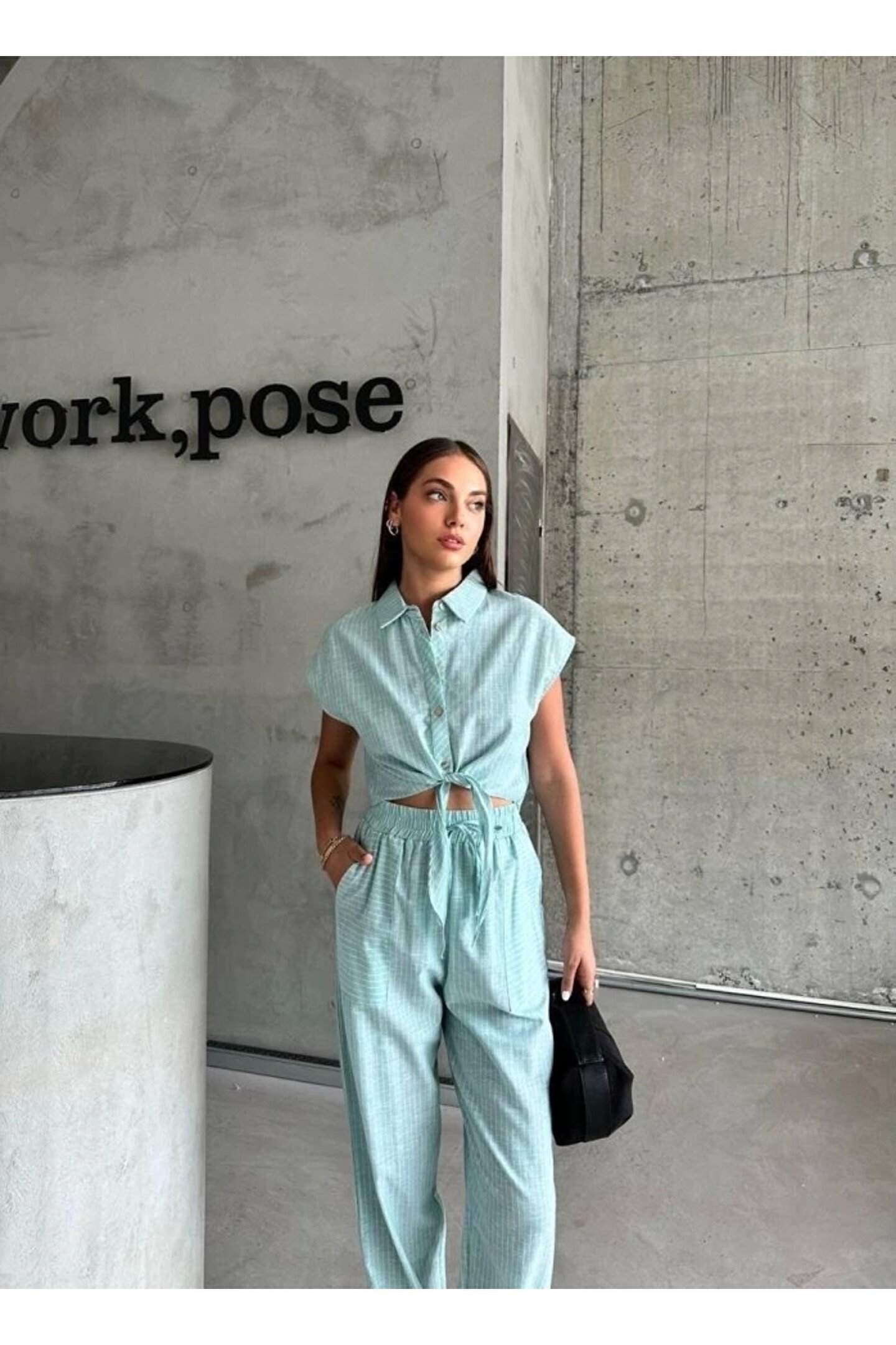 Serero ÇİZGİLİ KETEN KOLSUZ CROP PANTOLON TAKIM - Yeşil