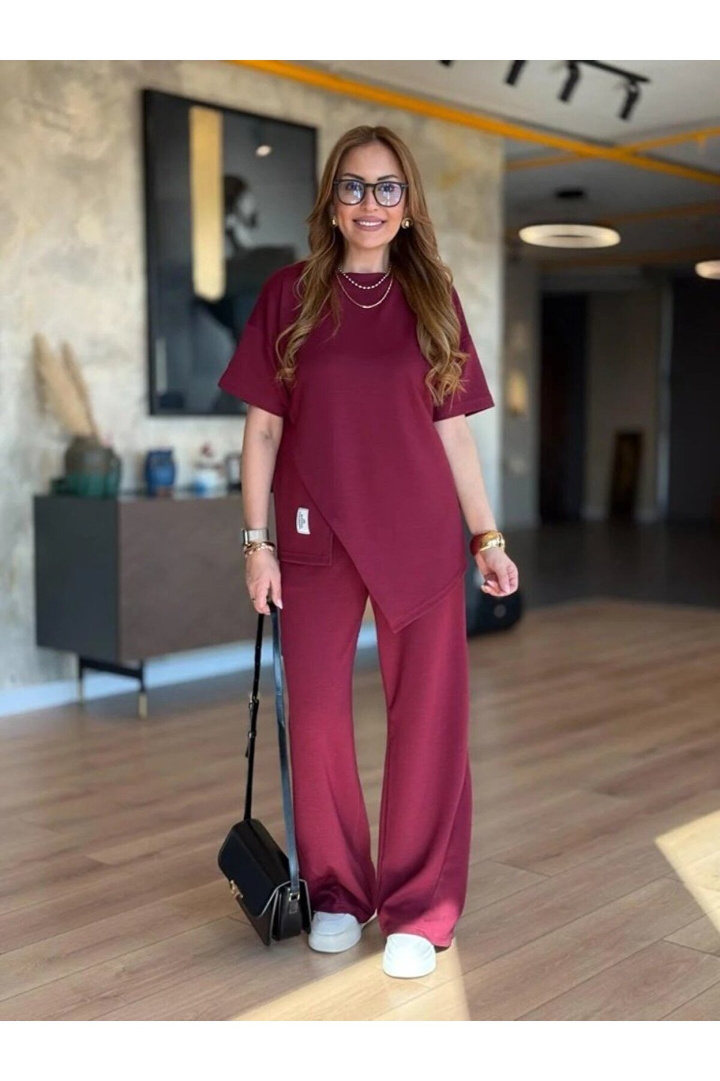 Serero Edolika Kadın Kısa Kollu Bisiklet Yaka Asimetrik Viskon Iki Iplik Bluz Ve Pantolon Ikili Takım
