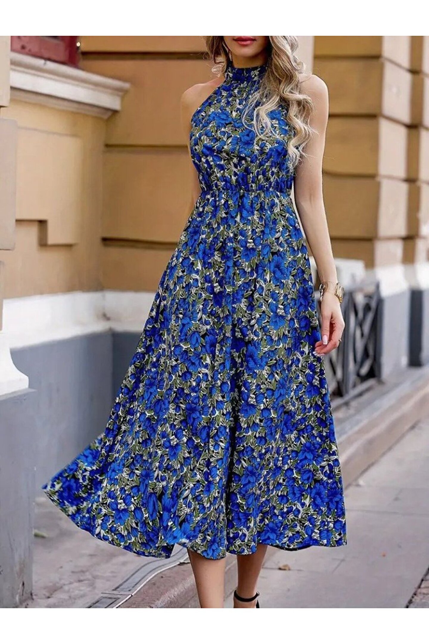 Kadın Omuzlardan Açık Daire Yaka Desenli Maxi Süprem Elbise