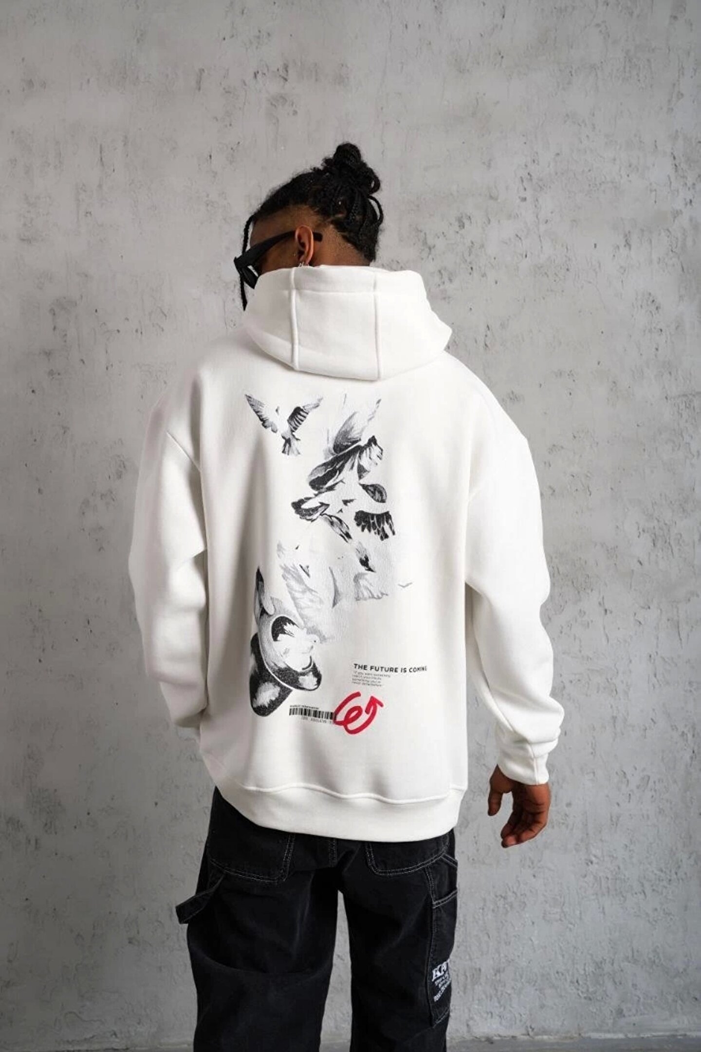 Erkek Şapkalı Güvercin Baskılı Kapşonlu Sweat - Beyaz