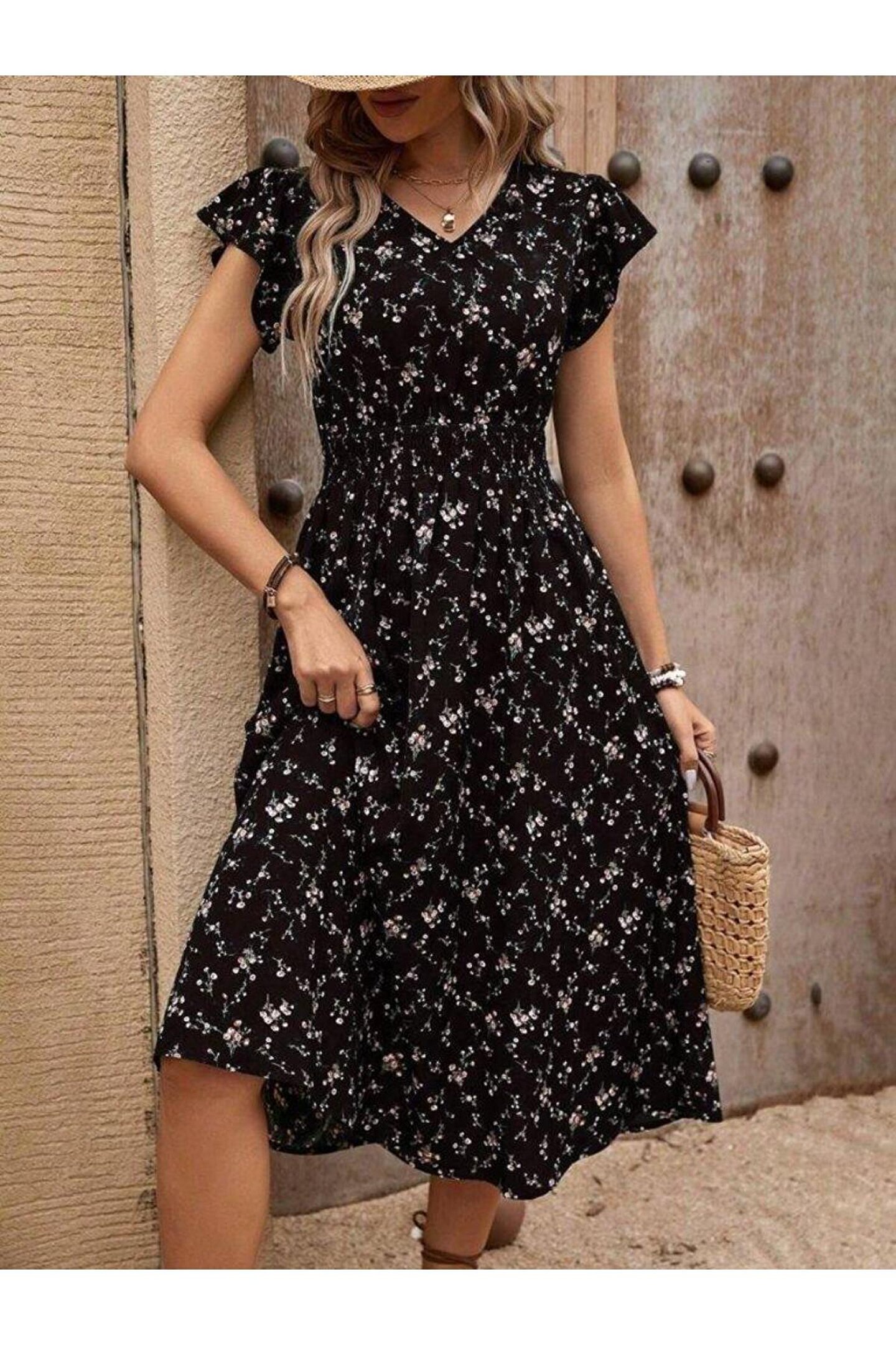 Serero Kadın Kısa Kollu V Yakalı Beli Lastikli çiçek Desenli Süprem Elbise