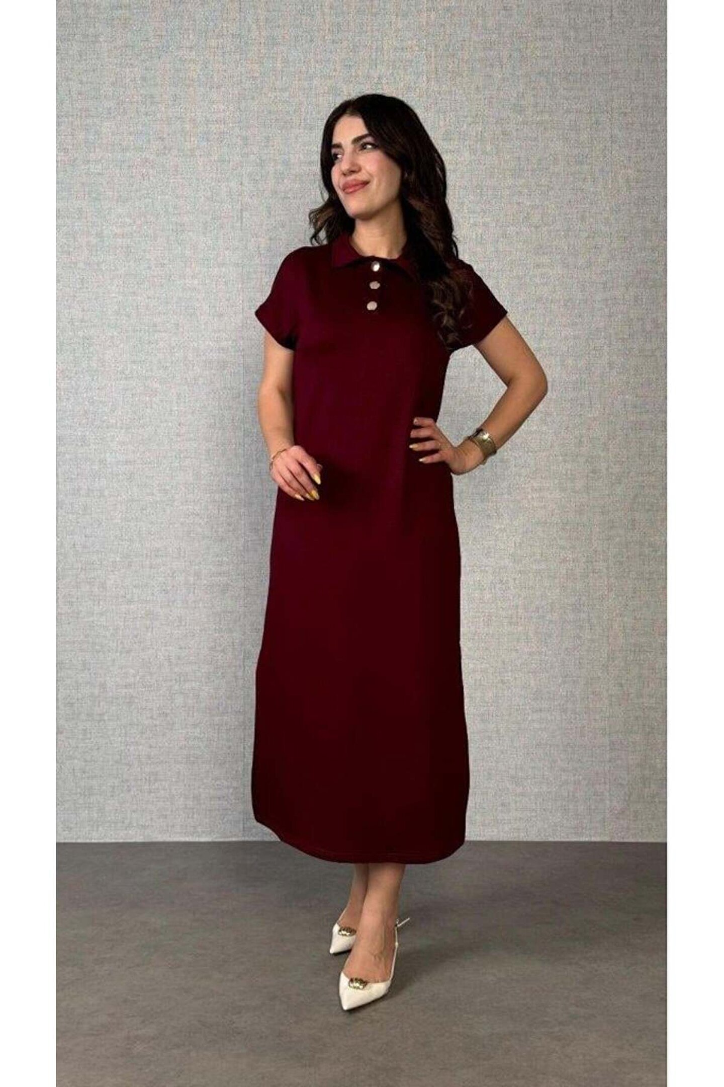 Kadın Kısa Kollu Yakalı Yandan Yırtmaçlı Viskon Iki Iplik Elbise