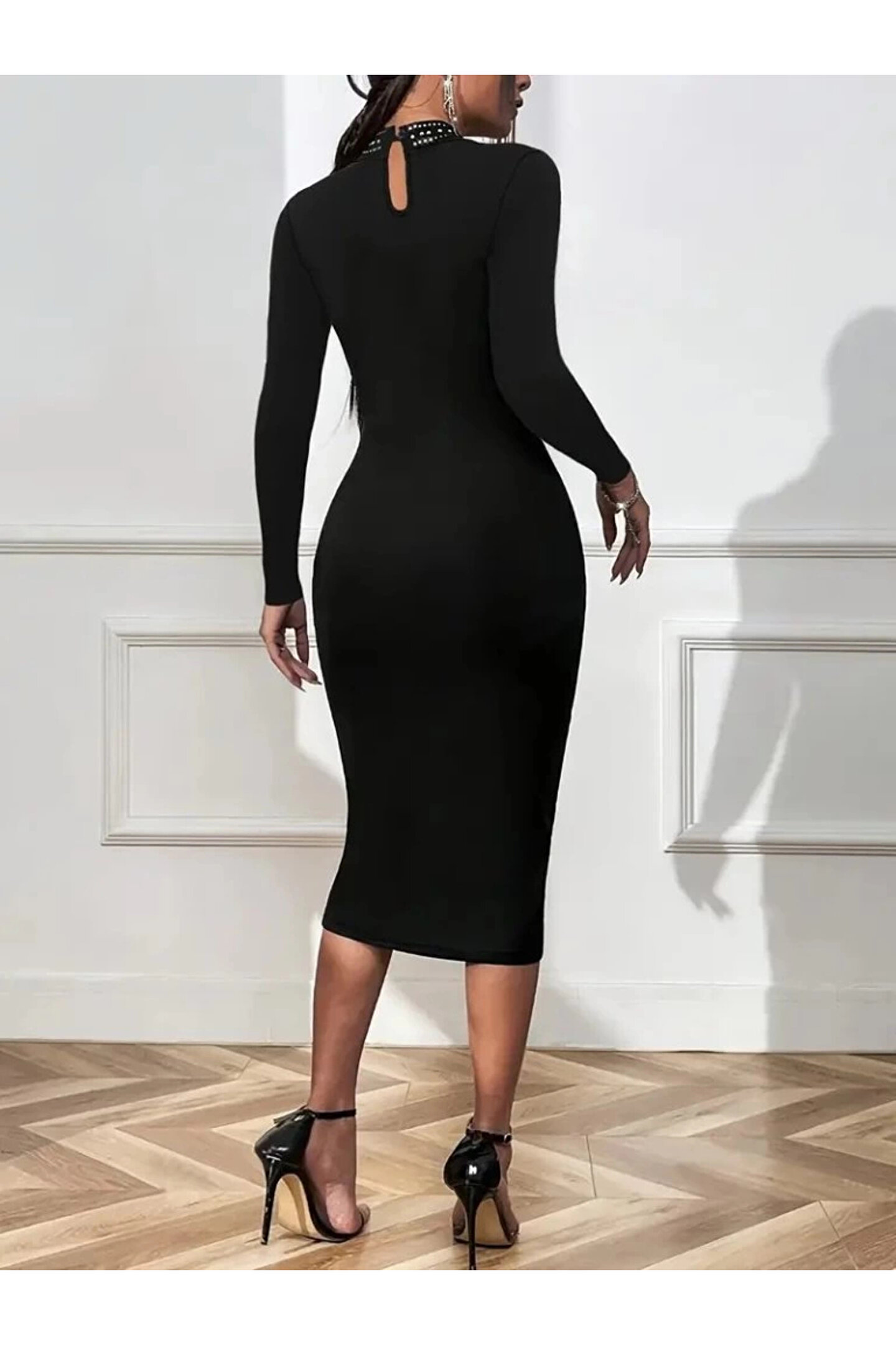 Serero Kadın Uzun Kollu Balıkçı Yaka Taşlı Damla Detay Midi Ithal Krep Elbise