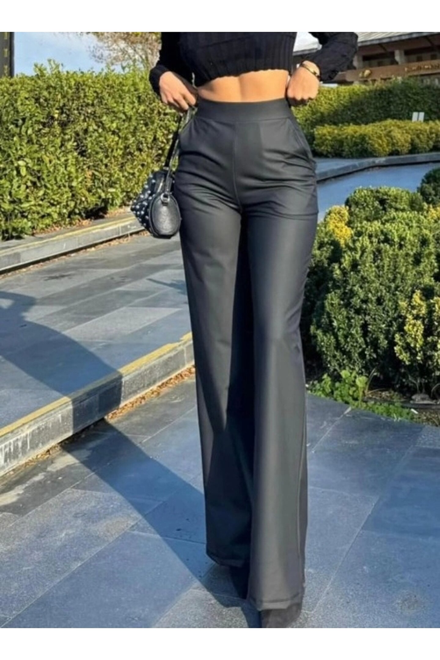 Kadın Yüksek Bel Cepli şardonlu Geniş Paçalı Mat Deri Pantolon