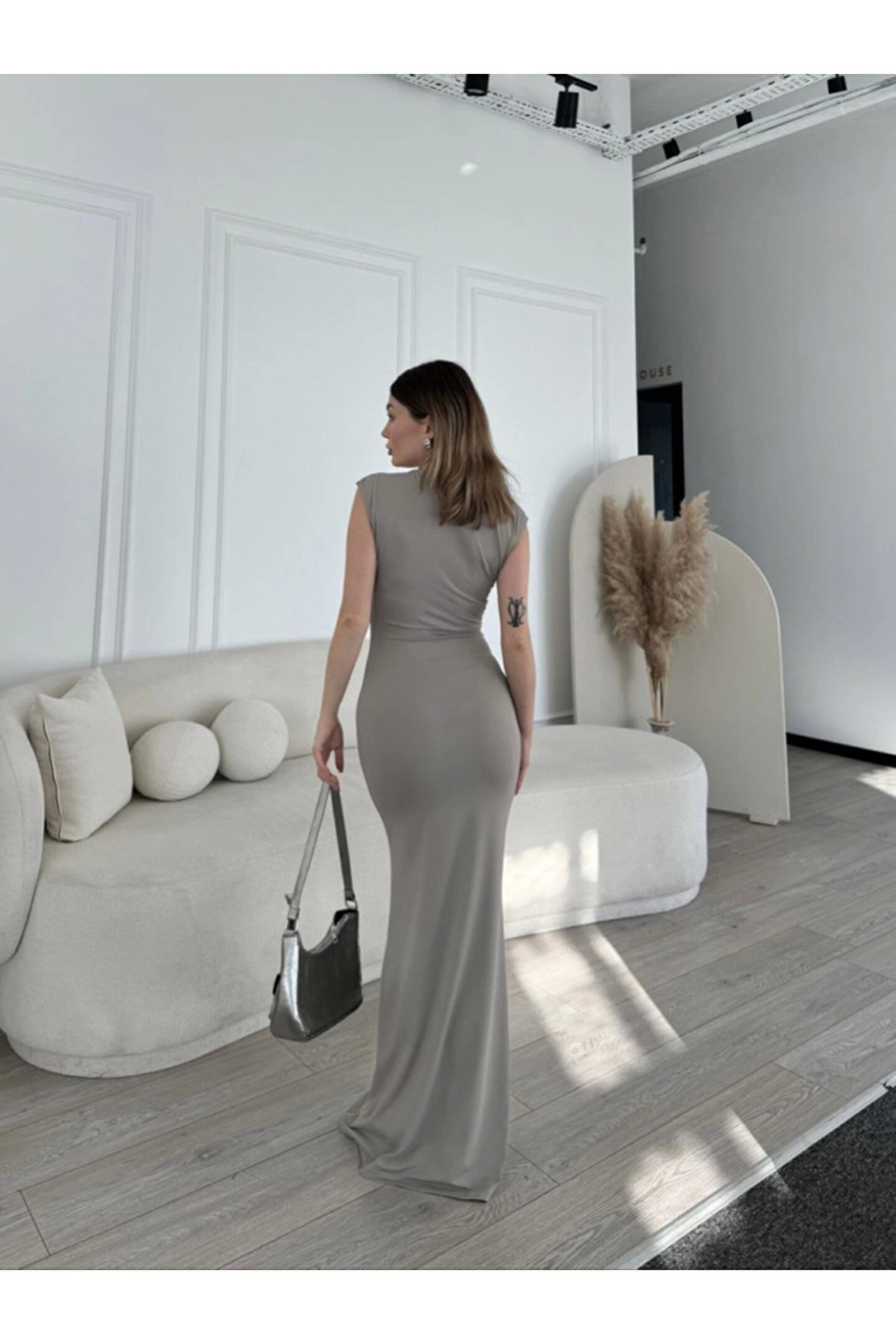 Serero Kolsuz Uzun Likralı Elbise - Gri