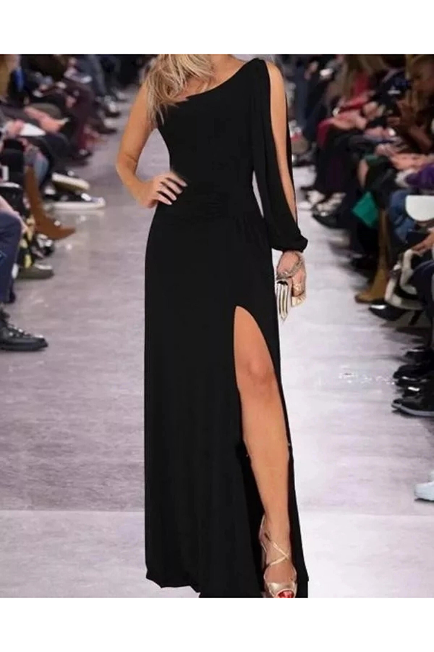 Tek Omuz Açık Derin Yırtmaçlı Krep Tam Boy Elbise