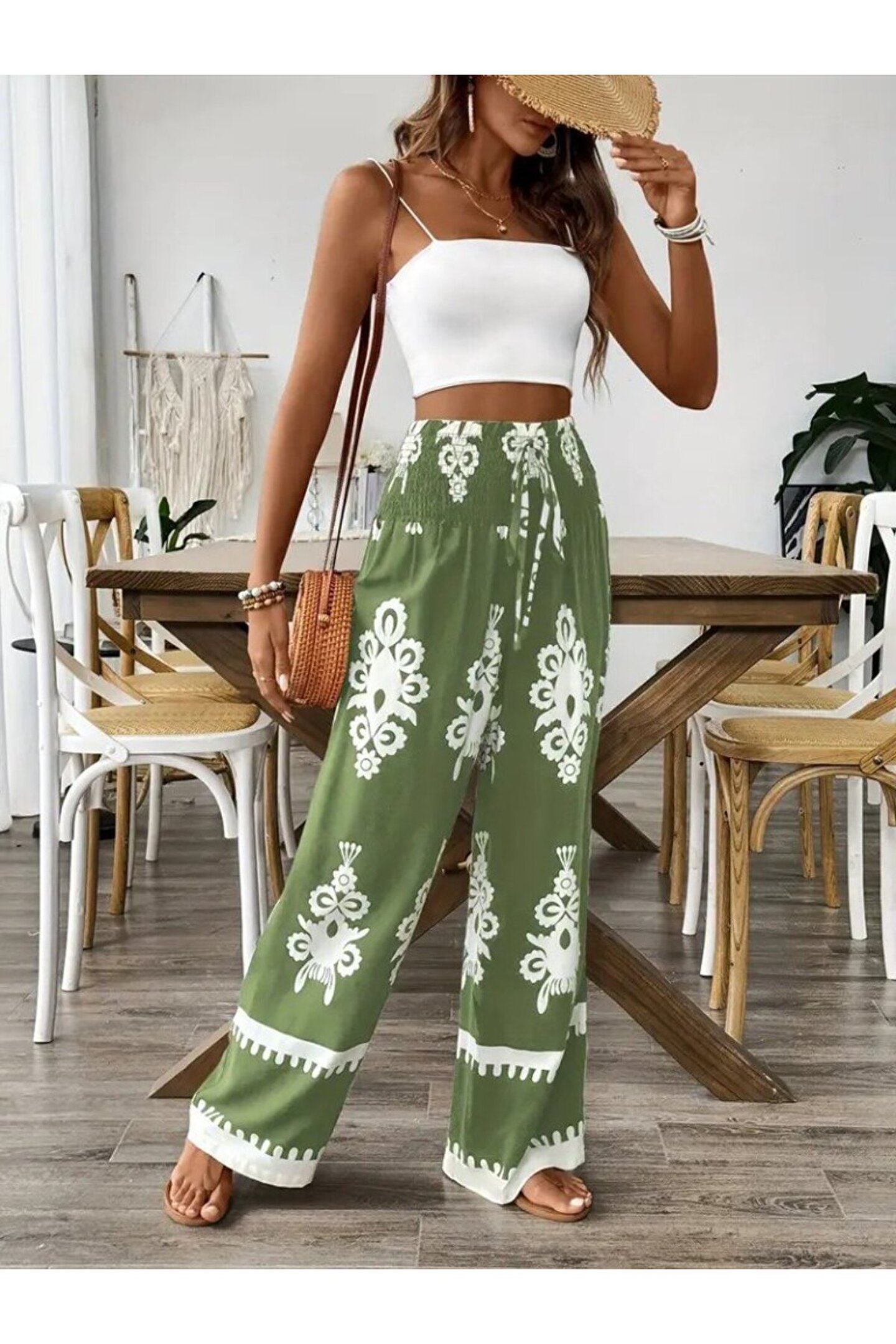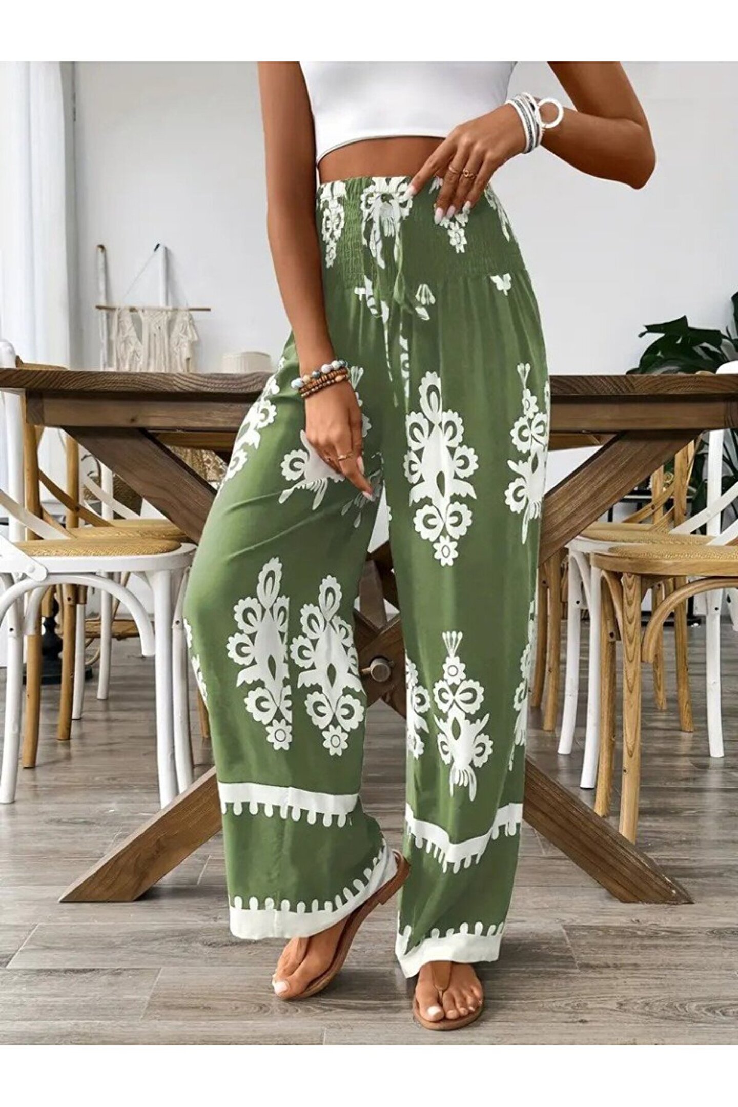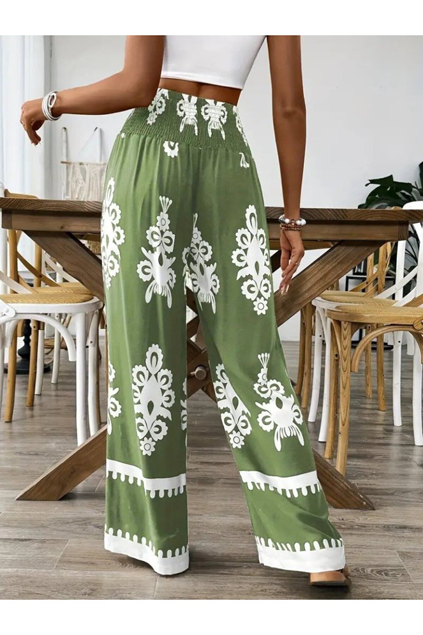 Kadın Yüksek Bel Büzgülü Etnik Desen Baskılı Süprem Pantolon