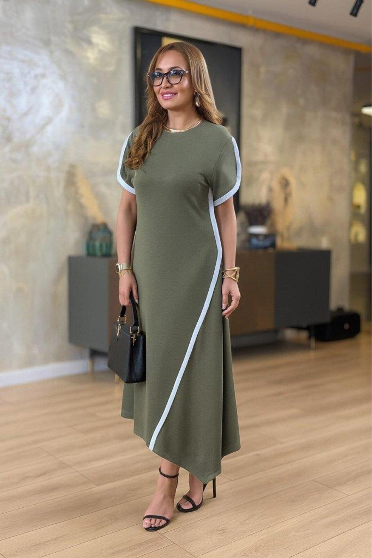 Kadın Kısa Kollu Bisiklet Yaka çift şerit Renk Detaylı Asimetrik Kesim Viskon Iki Iplik Elbise